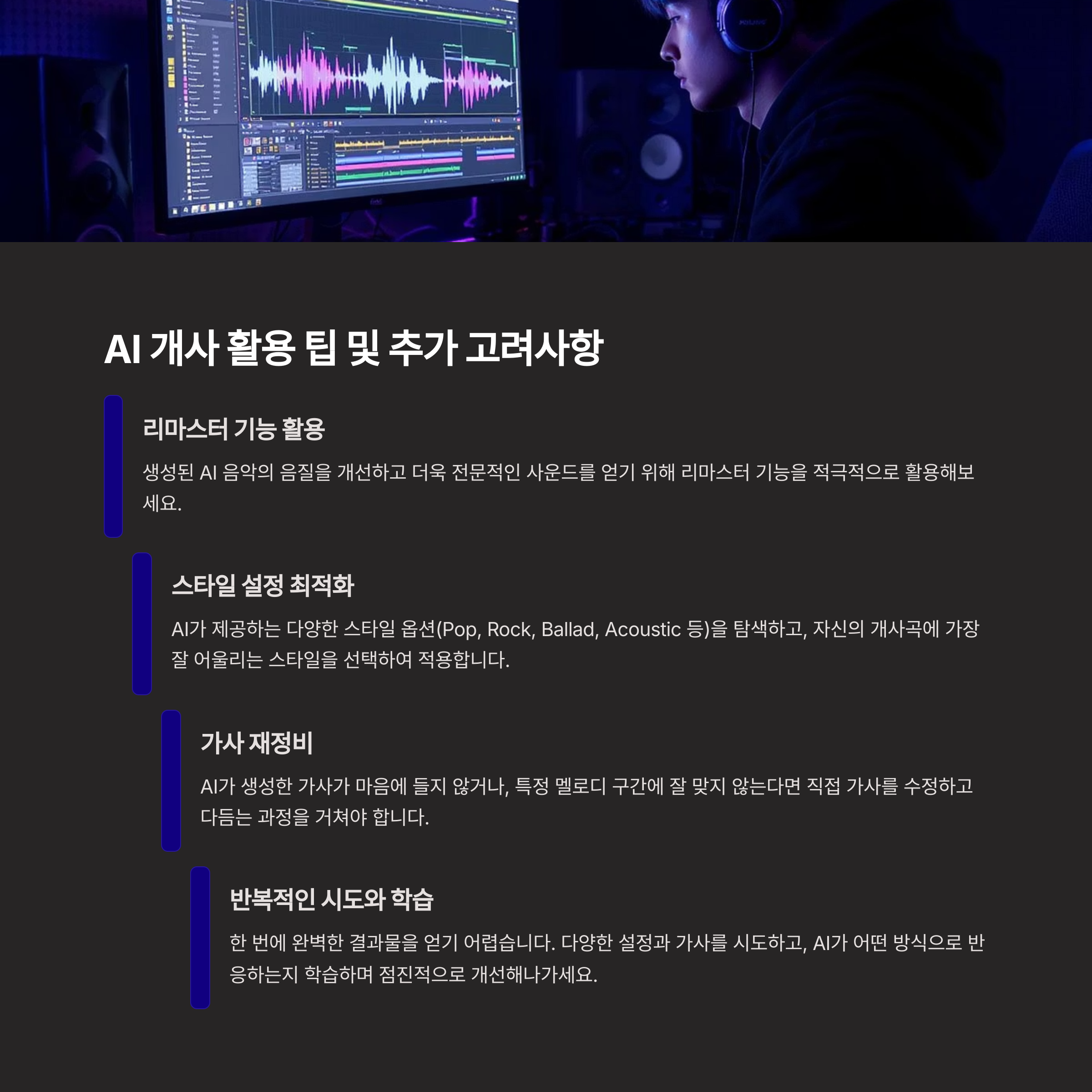 - 반복적인 시도와 학습: 한 번에 완벽한 결과물을 얻기 어렵습니다. 다양한 설정과 가사를 시도하고, AI가 어떤 방식으로 반응하는지 학습하며 점진적으로 개선해나가세요.