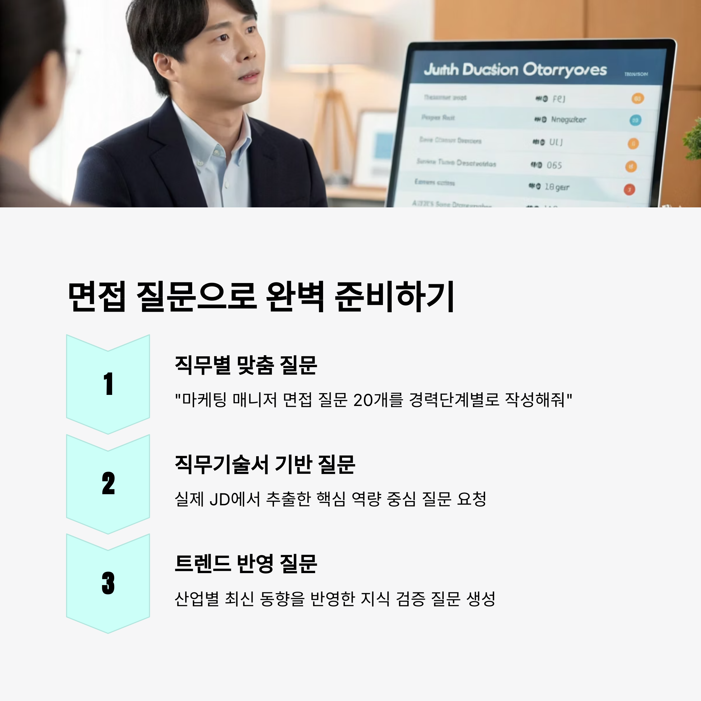 - 질문 예시: "A사 마케팅 직무 신입 면접을 준비 중입니다. 직무 중심의 예상 질문 10개 만들어줘."