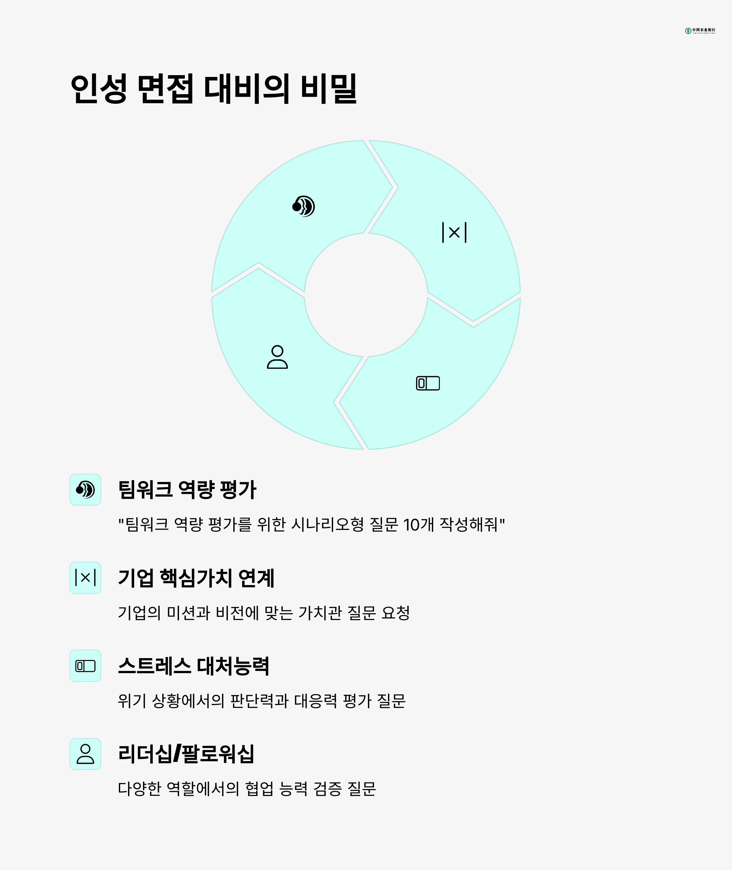 인성 면접에서는 지원자의 가치관과 대인관계 역량을 묻는 질문이 주를 이룹니다.