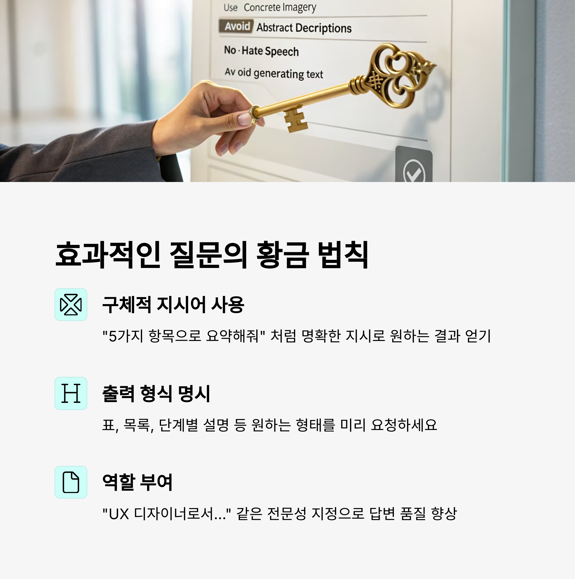 또한 원하는 답변 형식을 지정하거나, "단계별로 설명해줘", "모르겠으면 모른다고 말해줘" 같은 추가 지시어도 활용해 보세요.