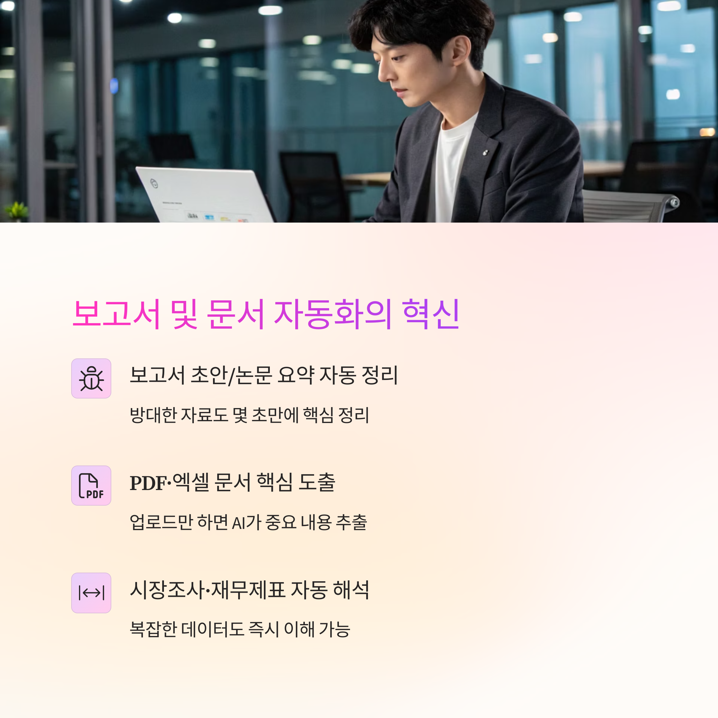 AI의 문맥 이해와 다양한 포맷 출력 기능이 강화되면서 기존 자동화 툴보다 훨씬 유연하게 업무에 적용할 수 있게 되었죠.