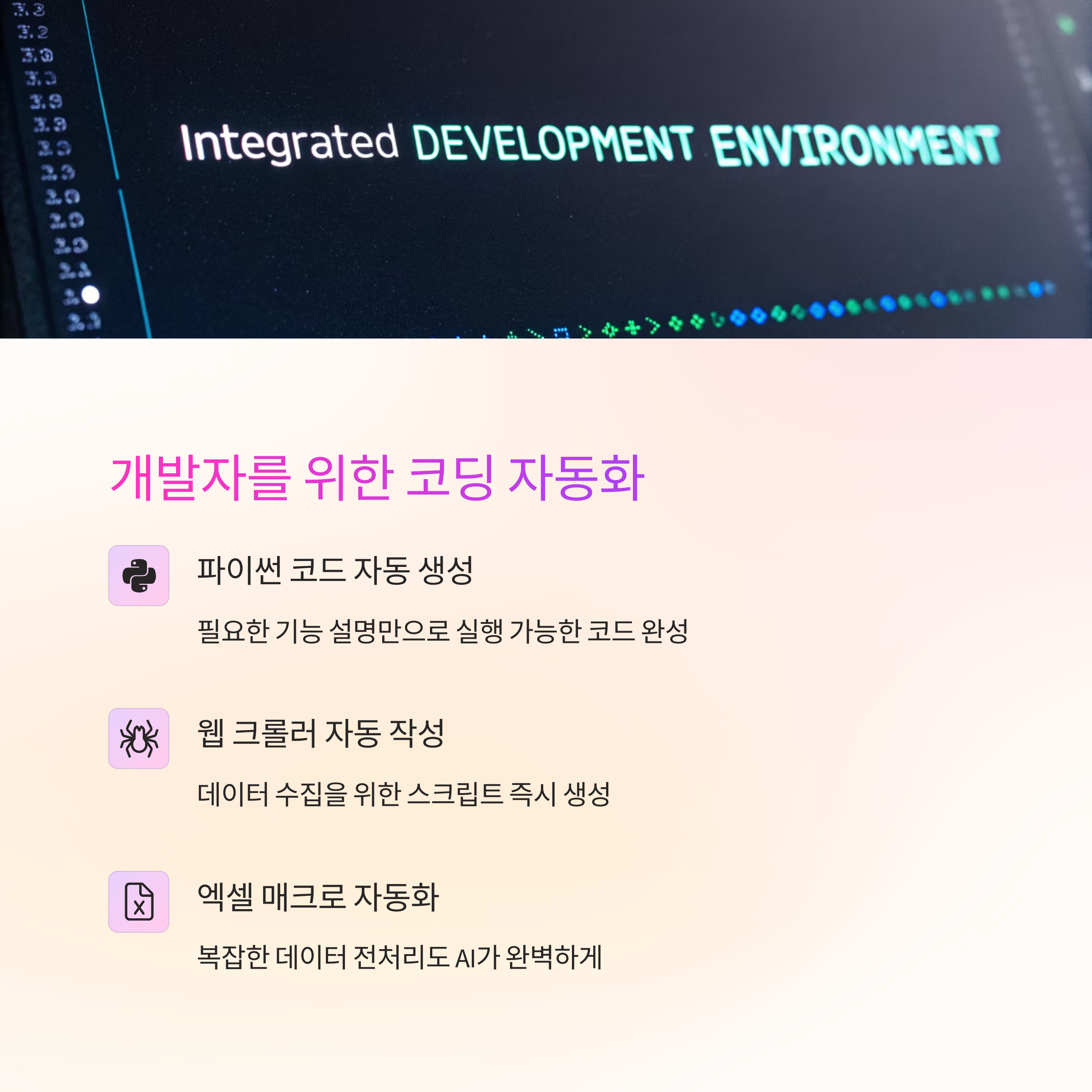 반복적인 사무 작업부터 데이터 분석, 콘텐츠 생성까지 폭넓게 활용되고 있으며, 특히 프리랜서, 스타트업, 중소기업에서 높은 생산성 향상을 보이고 있습니다.