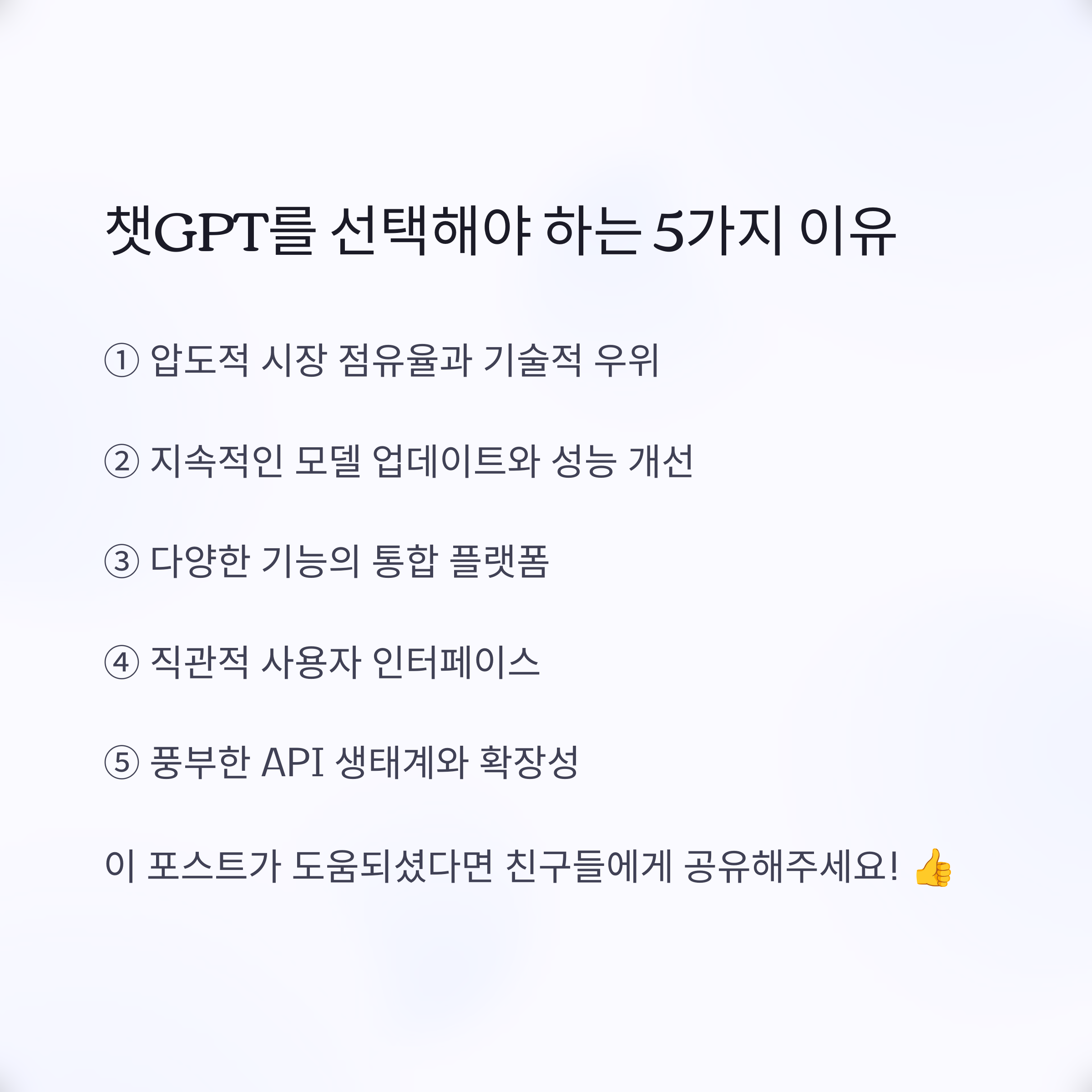 이 모든 요소가 합쳐져, 챗GPT는 단순한 ‘도구’를 넘어 이제는 일상과 업무에 꼭 필요한 존재로 자리잡고 있습니다.