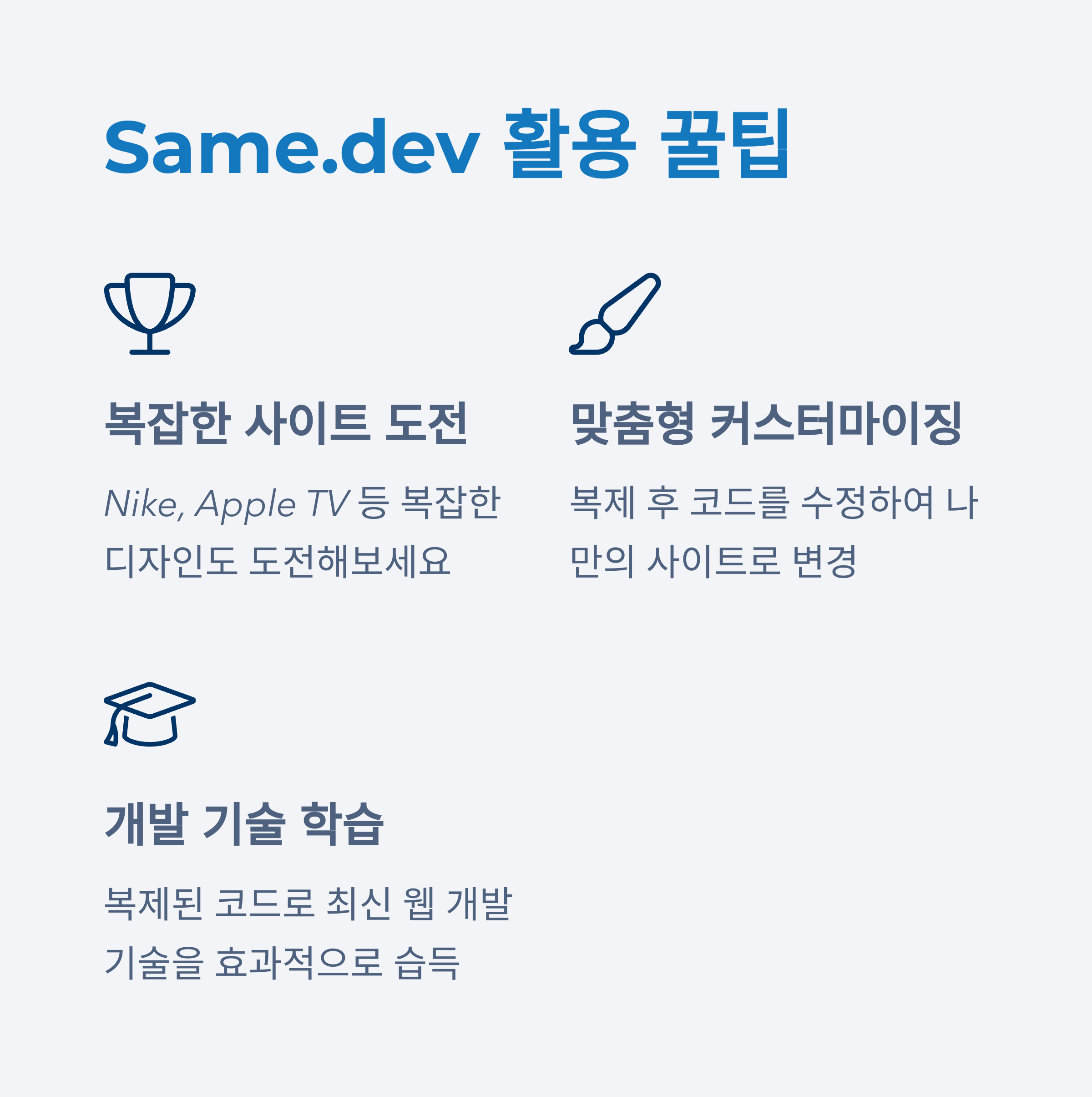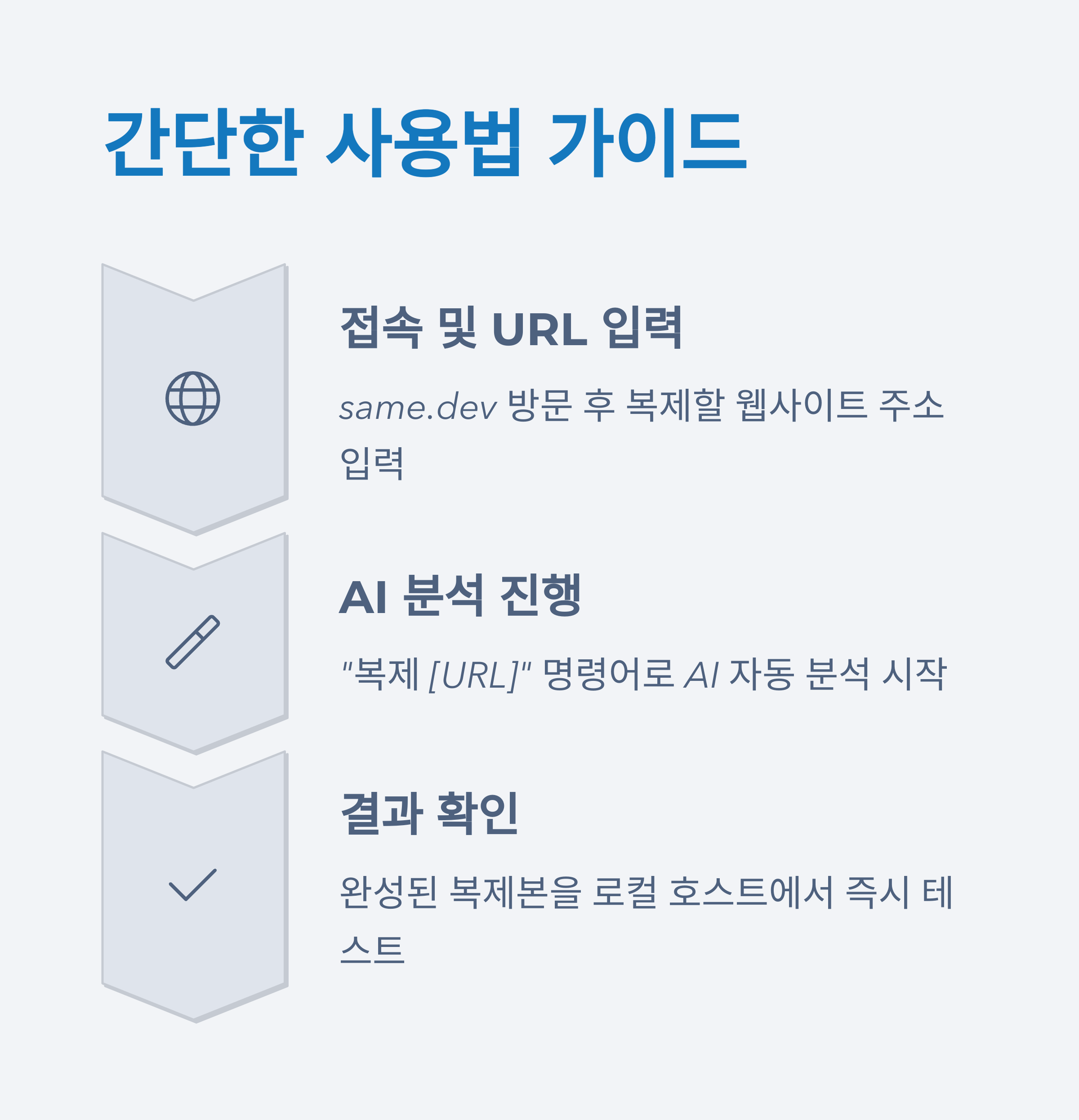 | AI 분석 및 복제 | same.dev가 실제 브라우저로 해당 사이트에 접속, UI 구조와 스타일을 분석하여 픽셀 퍼펙트 복제를 진행합니다. |