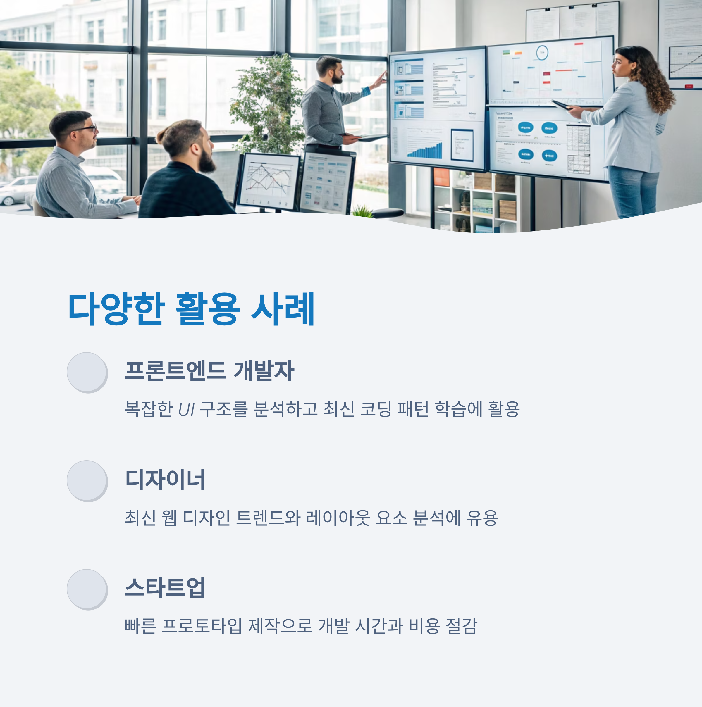- 프론트엔드 개발자: 복잡한 UI 구조를 빠르게 분석하고, 코드로 변환하여 학습 및 프로젝트에 활용합니다. 초기 개발 시간을 단축하고, 효율성을 높일 수 있습니다.
