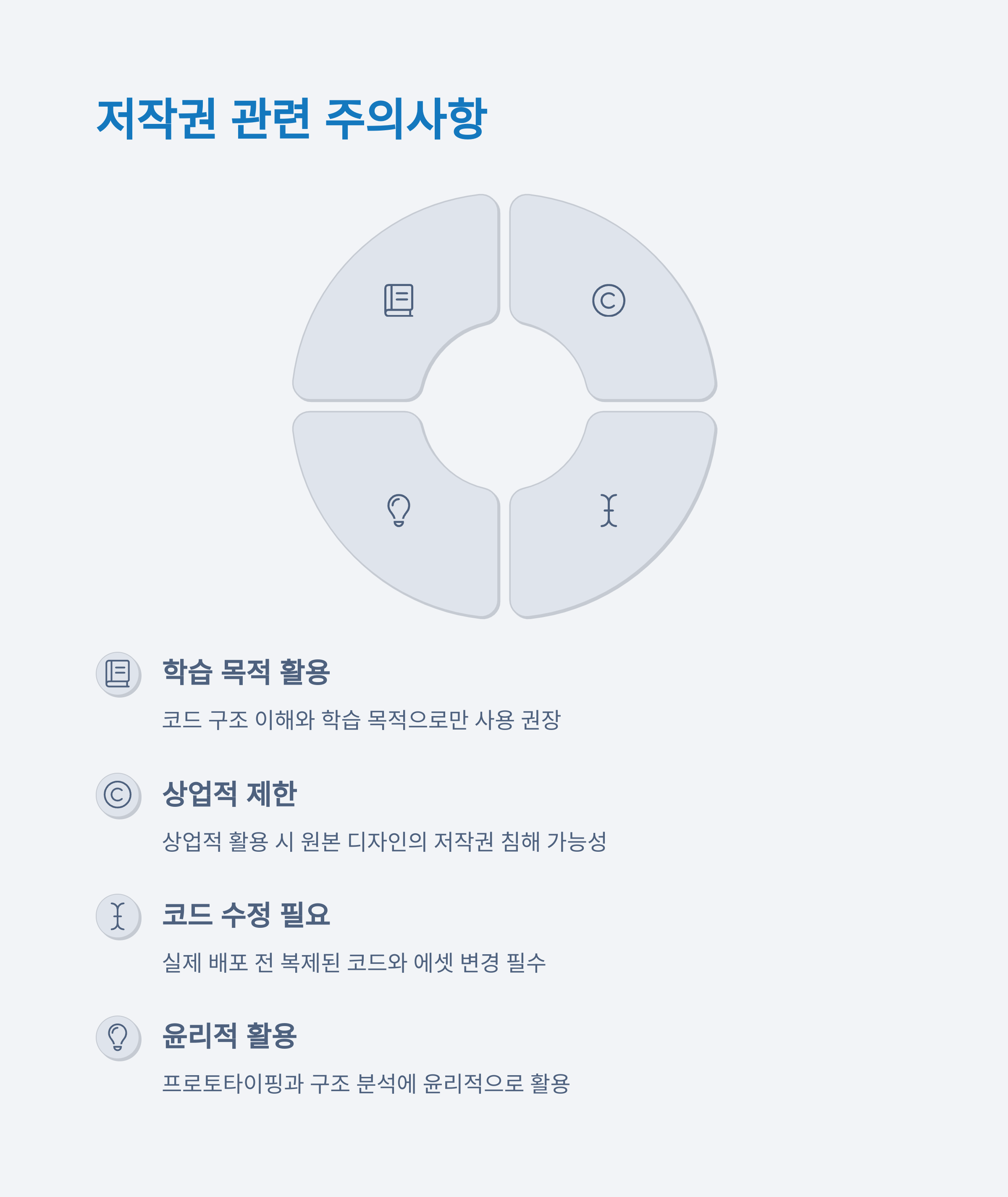아닙니다. 추출된 코드는 학습 및 연구 목적으로 활용하는 것이 권장되며, 상업적 사용 전에는 반드시 저작권 전문가와 상담하여 법적 문제를 피해야 합니다.