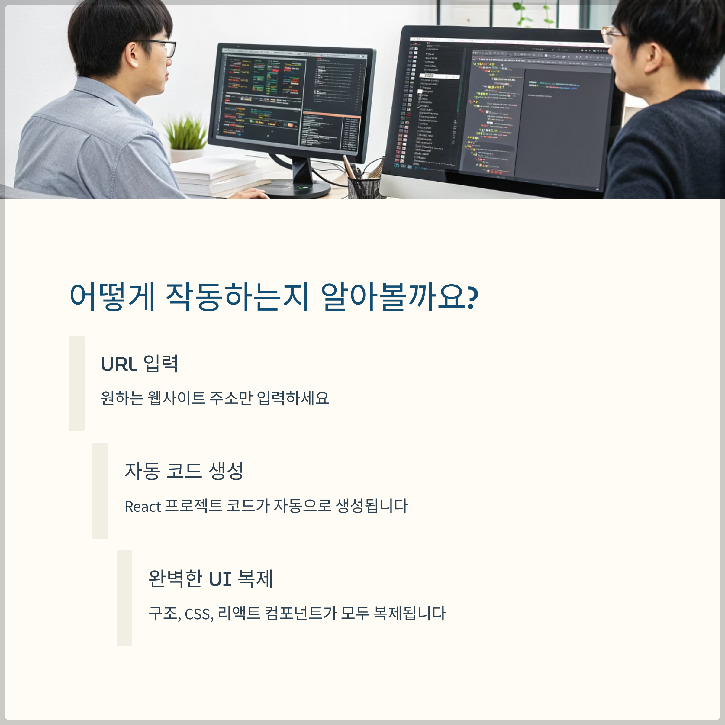 | 웹 UI 복제 | URL 입력 시 웹사이트 UI 및 코드 분석 후 편집 가능한 형태로 제공 | 프론트엔드 개발, 디자인 레퍼런스, 아이디어 구체화 |