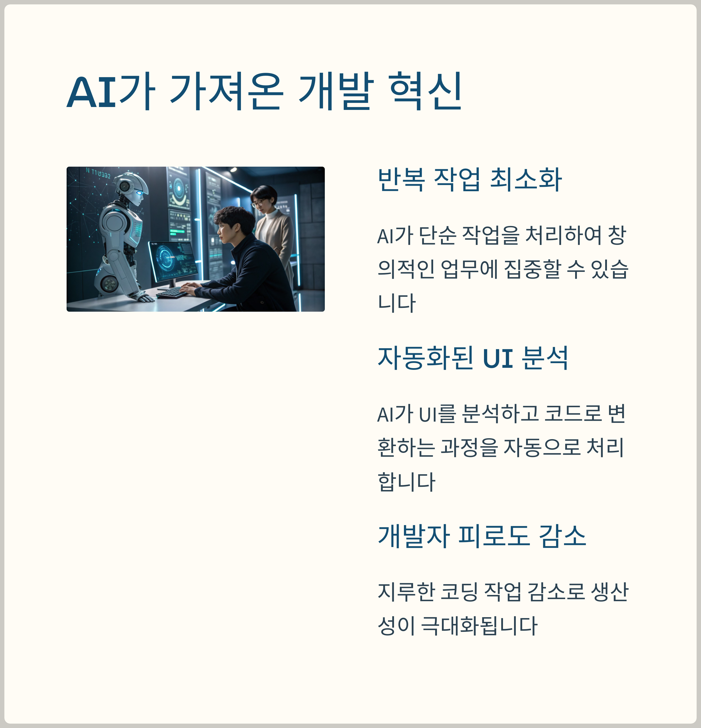 - AI 자동화: 코드 생성, 테스트, 디버깅 등 반복적인 작업을 AI가 처리하여 개발자의 업무 부담을 줄입니다.