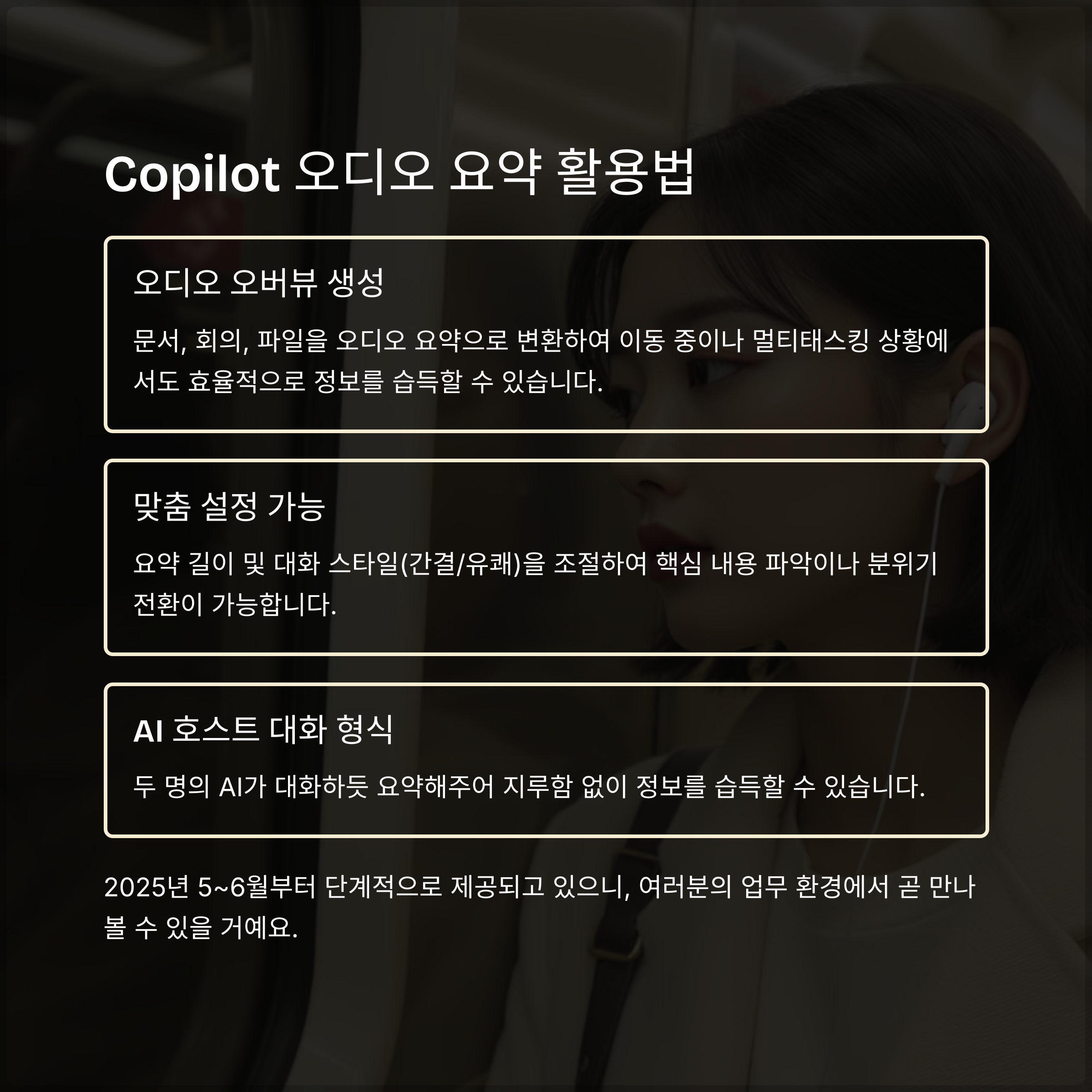 Copilot 채팅창에 "오디오 오버뷰 생성"을 요청하기만 하면, 두 명의 AI 호스트가 주요 내용을 대화 형식으로 요약해줍니다. 길이나 스타일(간결/유쾌) 등 맞춤 설정도 가능하여 이동 중이거나 멀티태스킹 상황에서도 효율적으로 정보를 습득할 수 있습니다.