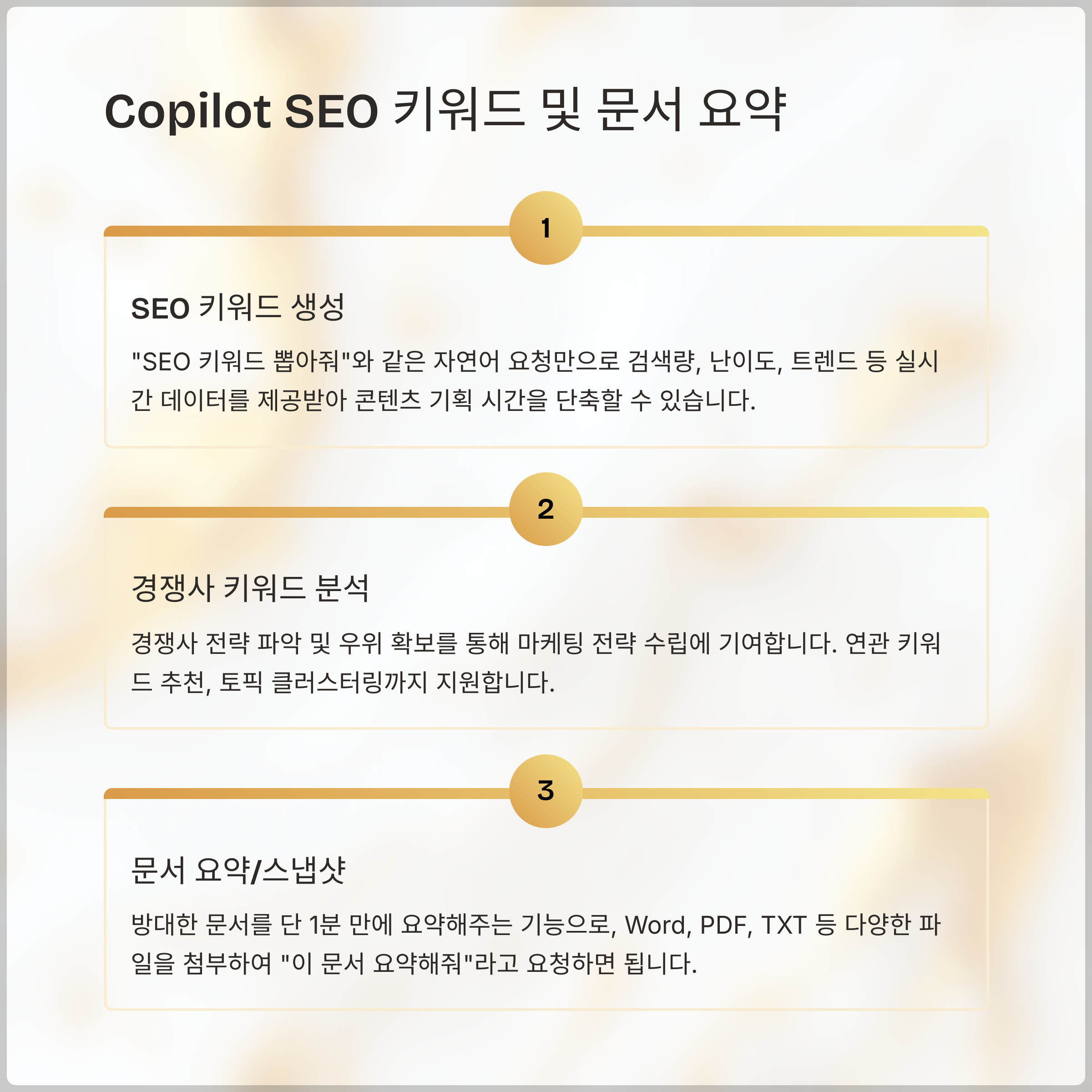 콘텐츠 마케팅을 위한 SEO 키워드 분석, 이제 Copilot에게 맡기세요. "SEO 키워드 뽑아줘", "경쟁사 분석해줘"와 같은 자연어 요청만으로 Copilot은 구글 키워드 플래너 등과 연동하여 검색량, 난이도, 트렌드 등 실시간 데이터를 제공합니다.