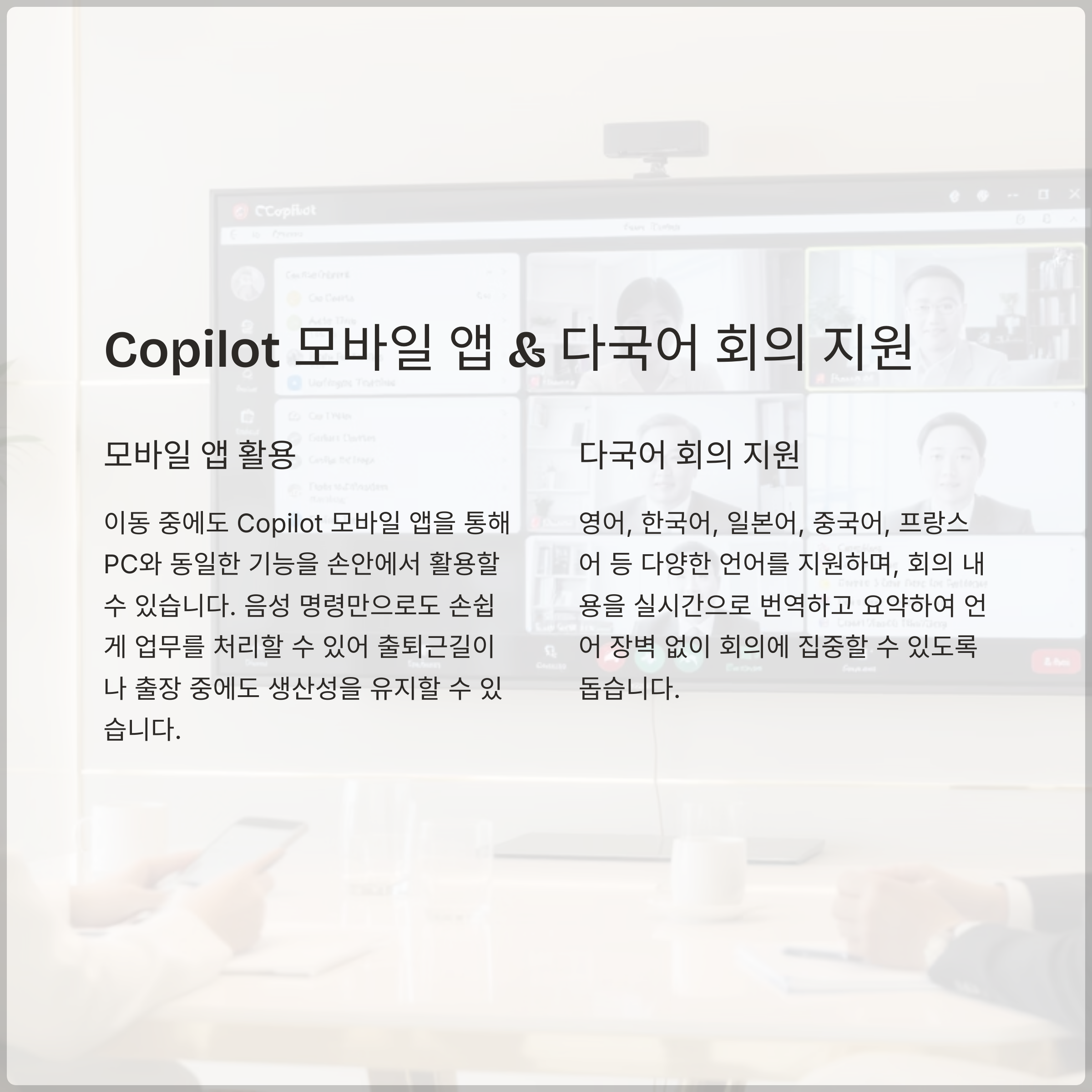 글로벌 비즈니스 환경에서 다국어 회의는 피할 수 없는 현실입니다. Copilot은 이러한 다국어 회의의 장벽을 허물어줍니다. 현재 영어, 한국어, 일본어, 중국어, 프랑스어, 독일어, 이탈리아어, 포르투갈어(브라질), 스페인어 등 다양한 언어를 지원하며, 2025년 6월부터 단계적으로 제공되고 있습니다.