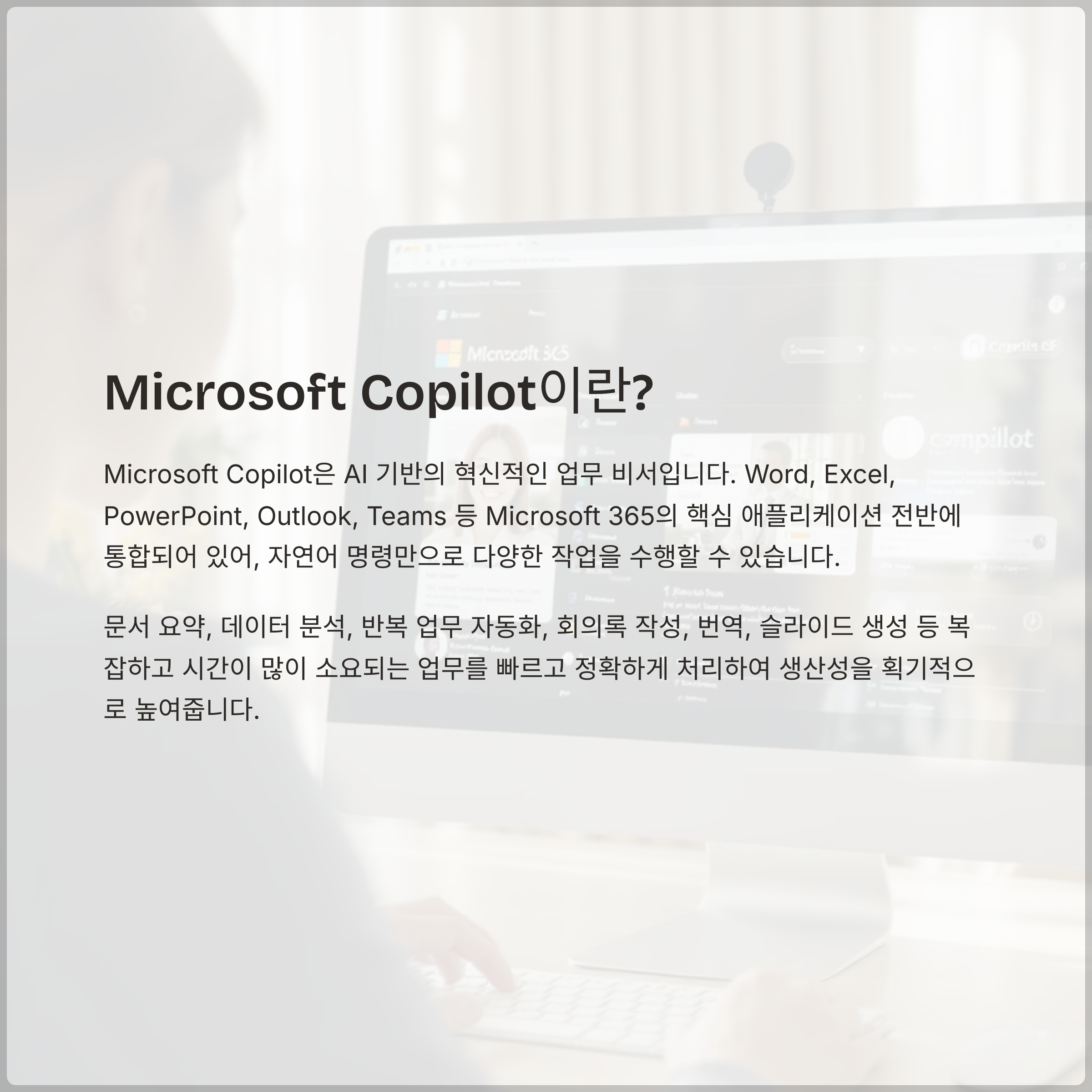 Microsoft Copilot은 AI 기반의 혁신적인 업무 비서입니다. Word, Excel, PowerPoint, Outlook, Teams 등 Microsoft 365의 핵심 애플리케이션 전반에 통합되어 있어, 자연어 명령만으로 다양한 작업을 수행할 수 있도록 돕습니다.