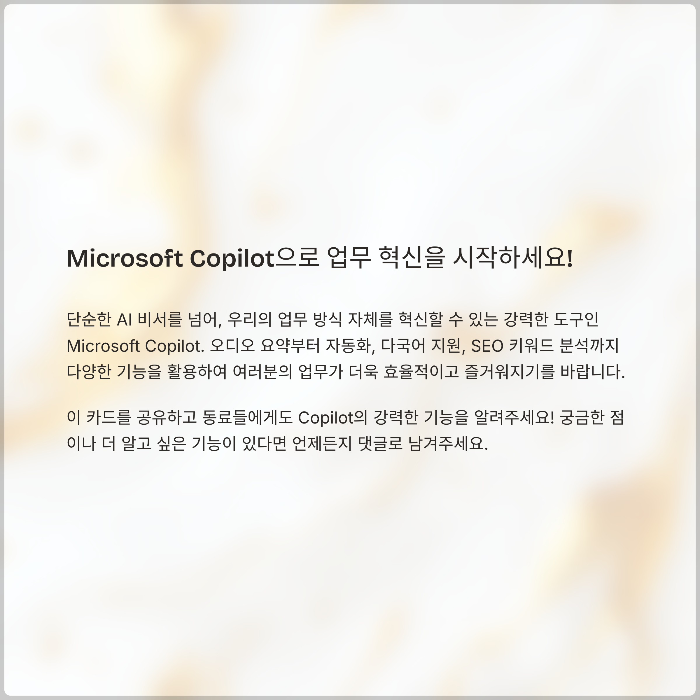 오늘은 Microsoft Copilot의 다양한 기능과 실전 활용 꿀팁을 소개해 드렸습니다. 단순한 AI 비서를 넘어, 우리의 업무 방식 자체를 혁신할 수 있는 강력한 도구라는 것을 느끼셨기를 바랍니다. Copilot을 통해 여러분의 업무가 더욱 효율적이고 즐거워지기를 응원하며, 궁금한 점이나 더 알고 싶은 기능이 있다면 언제든지 댓글로 남겨주세요!