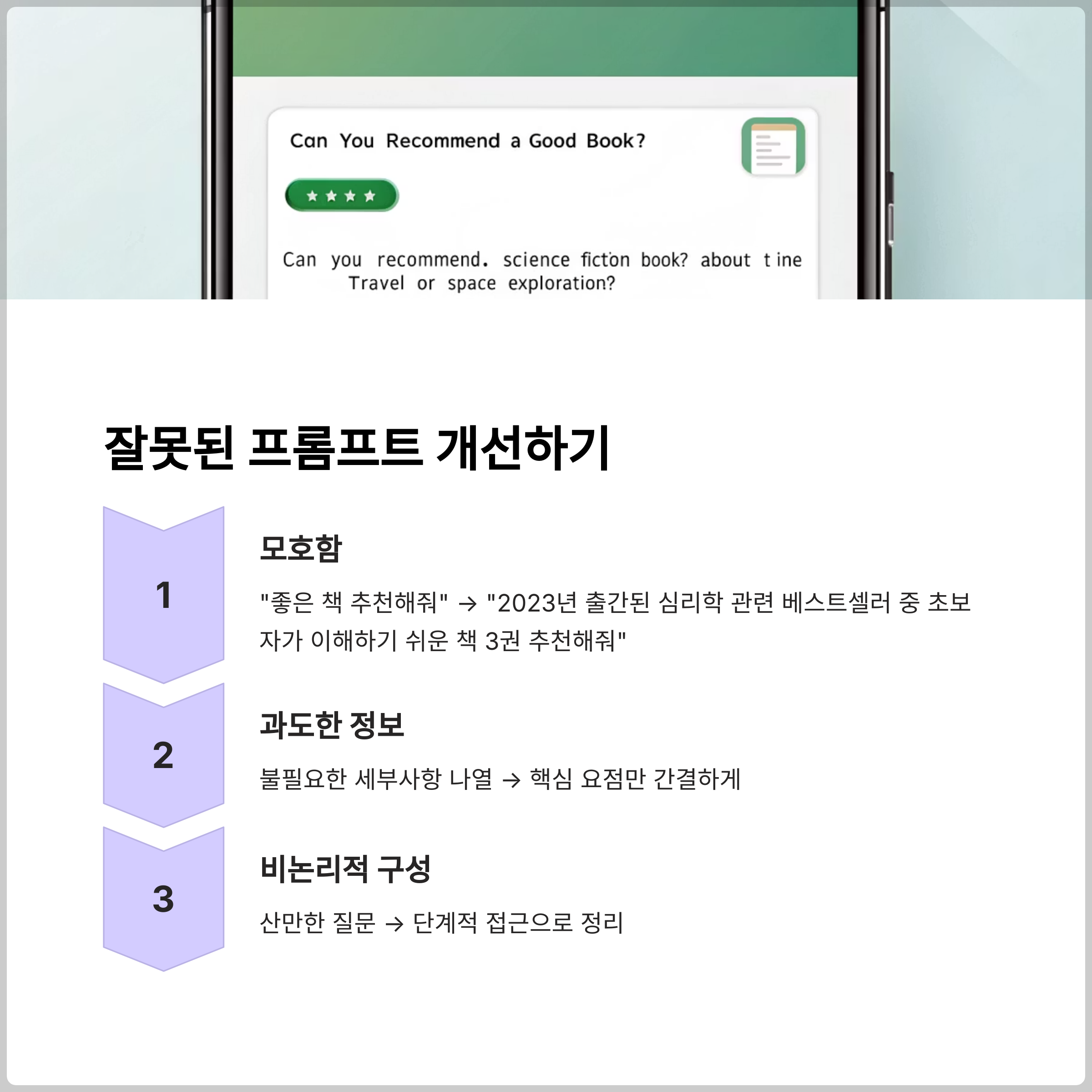 챗GPT에 원하는 답을 받지 못했다면, 프롬프트 구조에 문제가 있을 수 있습니다. 아래는 대표적인 오류와 개선 사례입니다.