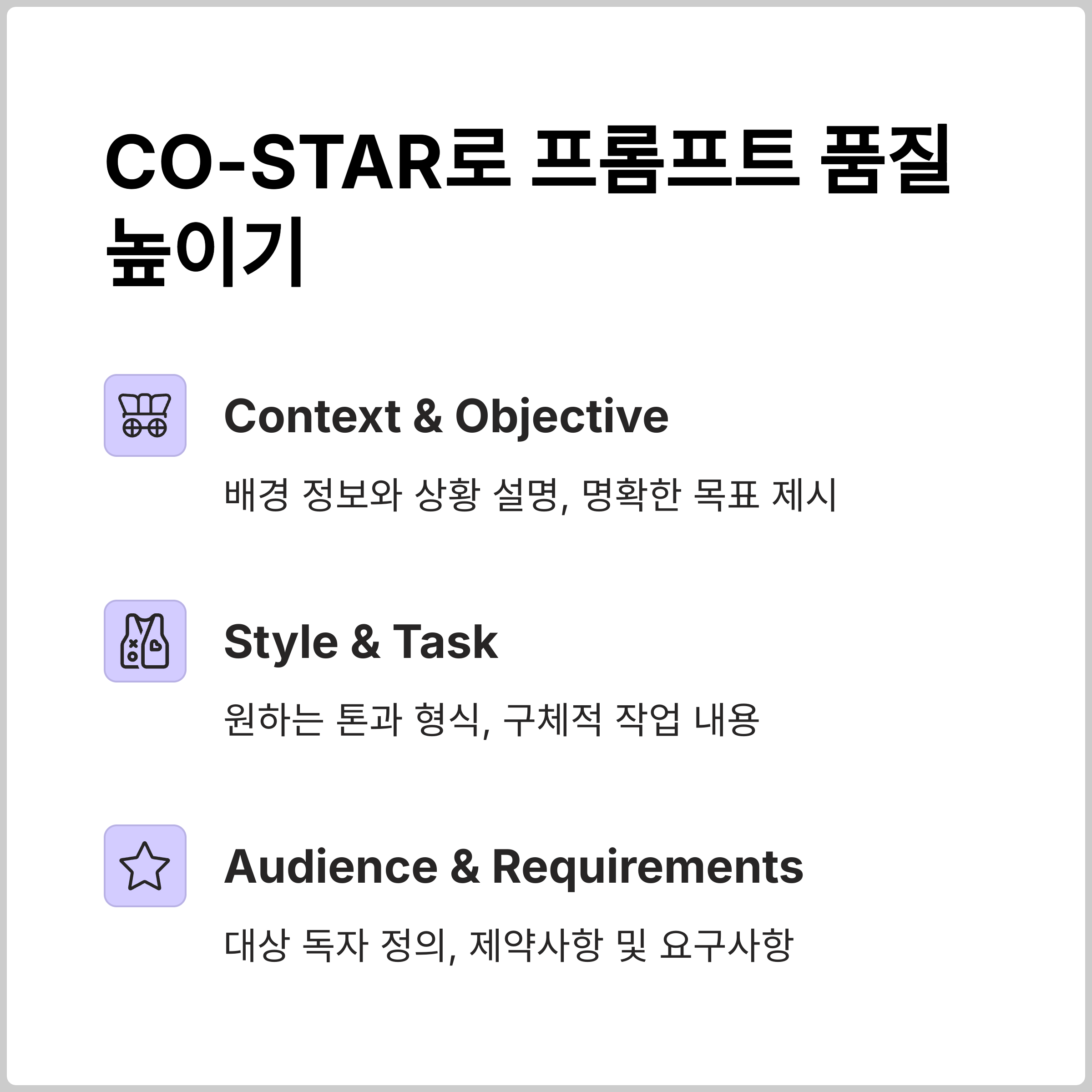 이처럼 CO-STAR 항목을 포함해 요청하면 응답 품질이 급상승합니다.