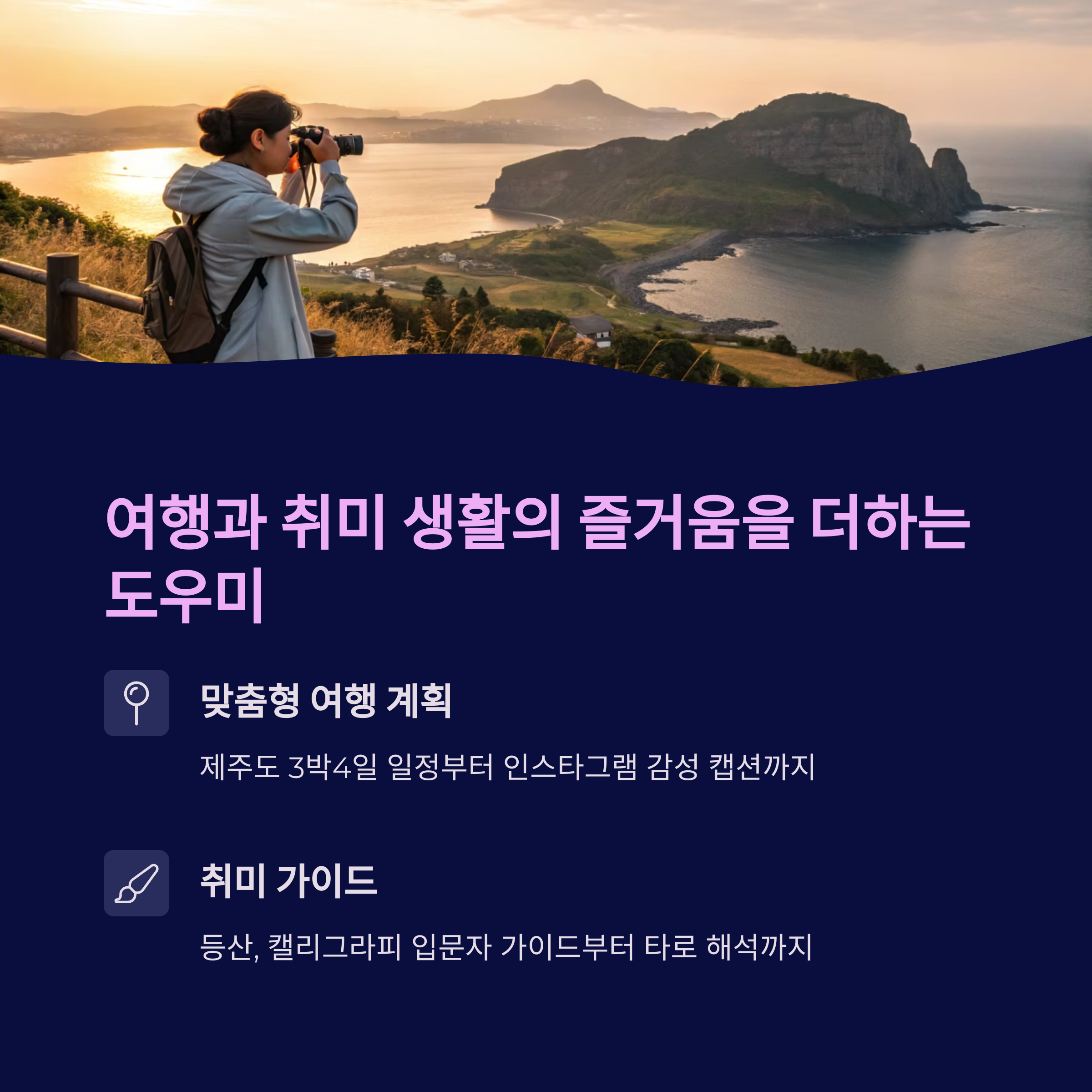사용자 맞춤형 여행 코스 제안은 물론, 인스타 감성 문구 생성, 타로 카드 해석 등 감성 콘텐츠 제작까지 가능합니다.