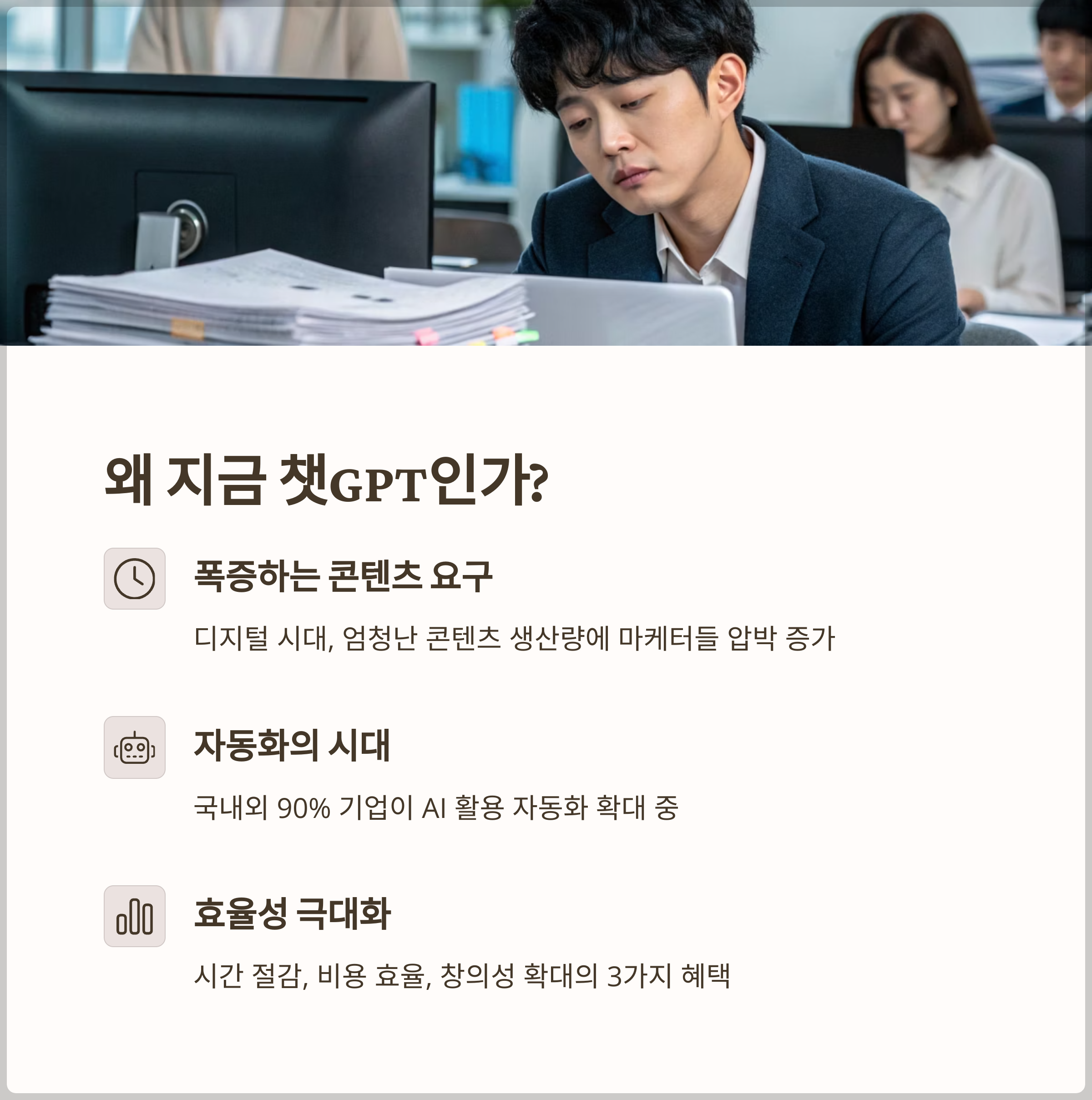 AI가 마케팅 현장을 뒤바꾸고 있습니다. 챗GPT를 활용한 콘텐츠 자동화 전략, 지금부터 살펴보세요!