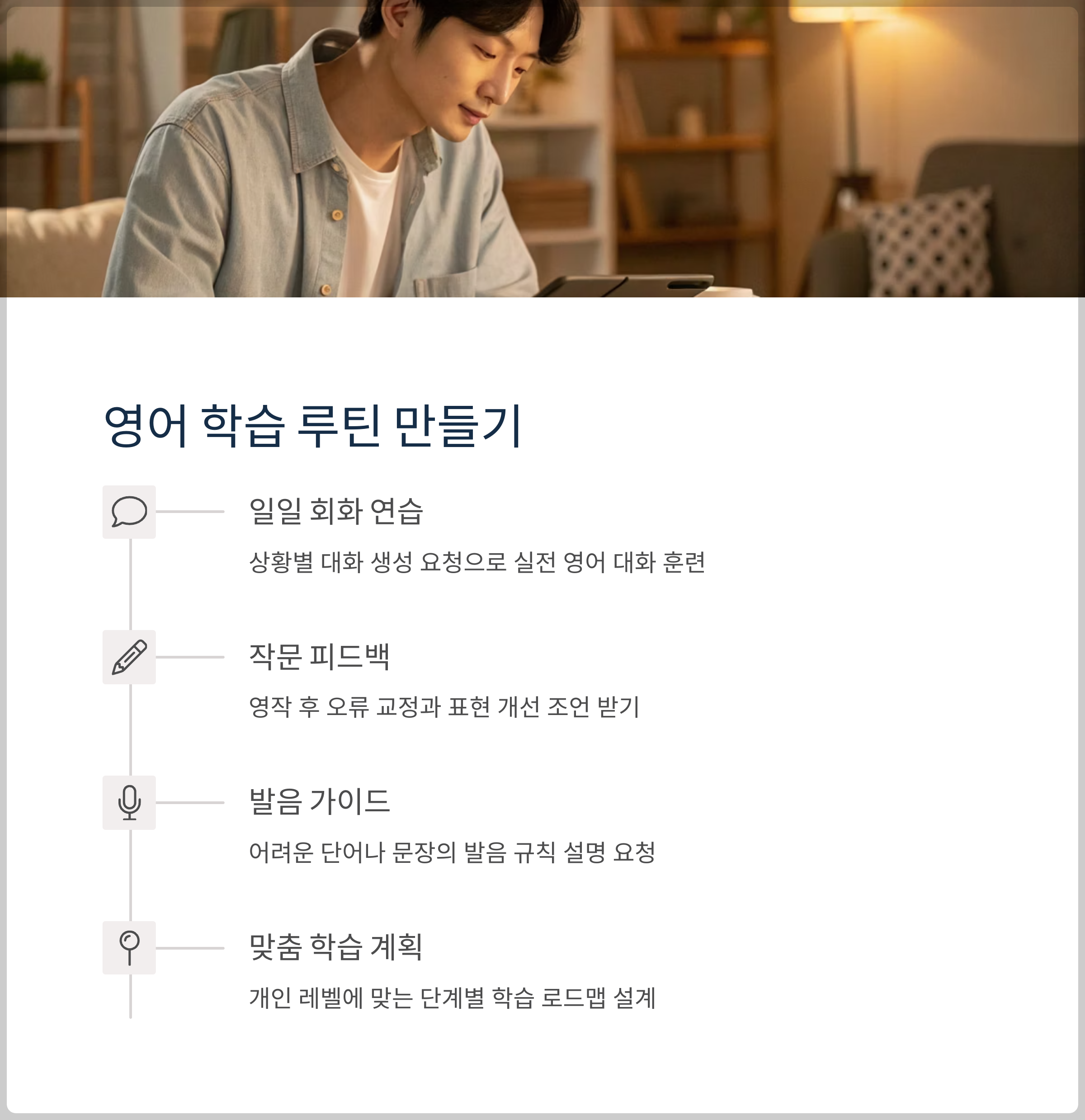 | 월요일 | 자기소개 연습 | "아래 내용을 영어 자기소개로 자연스럽게 바꿔줘" |