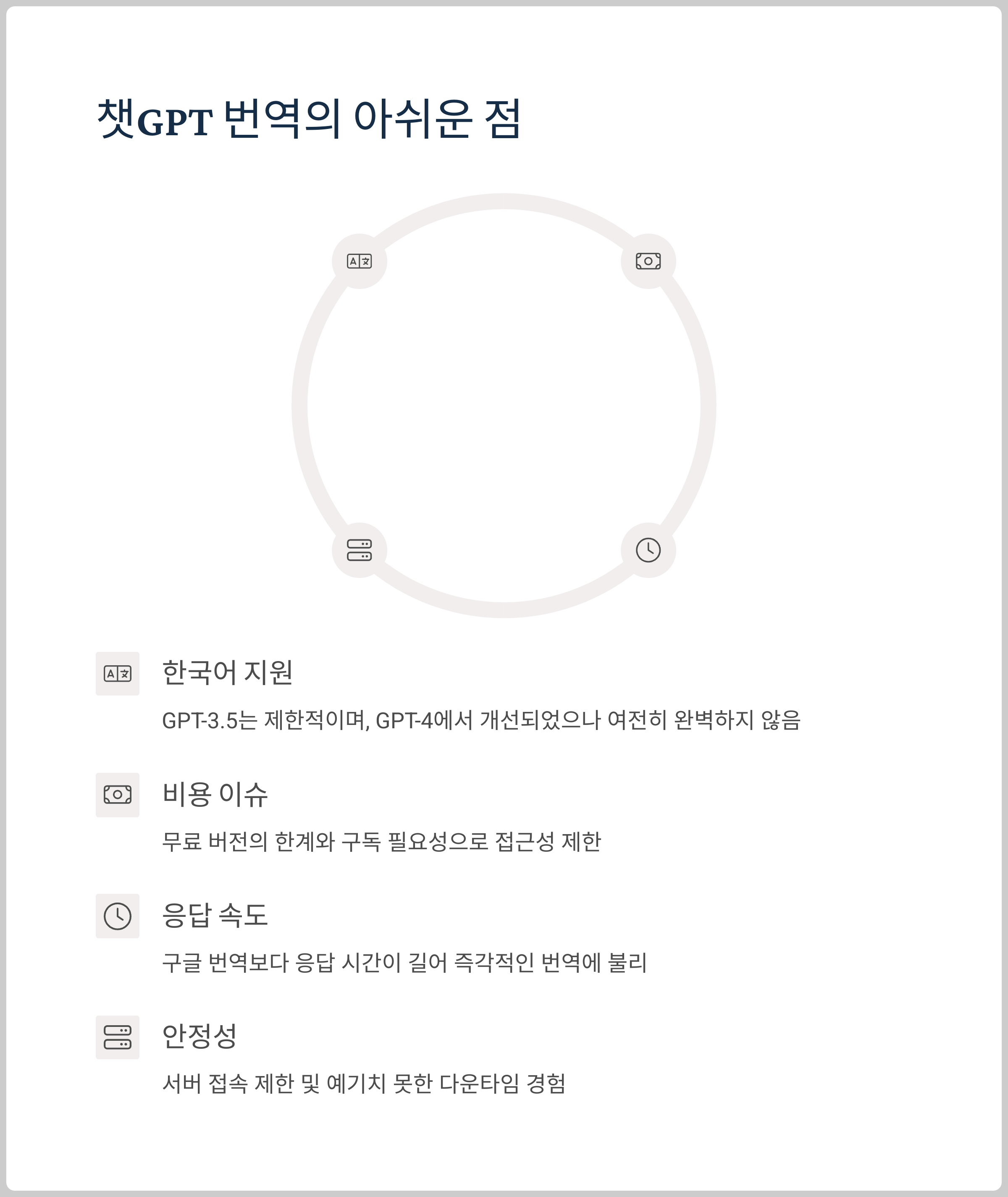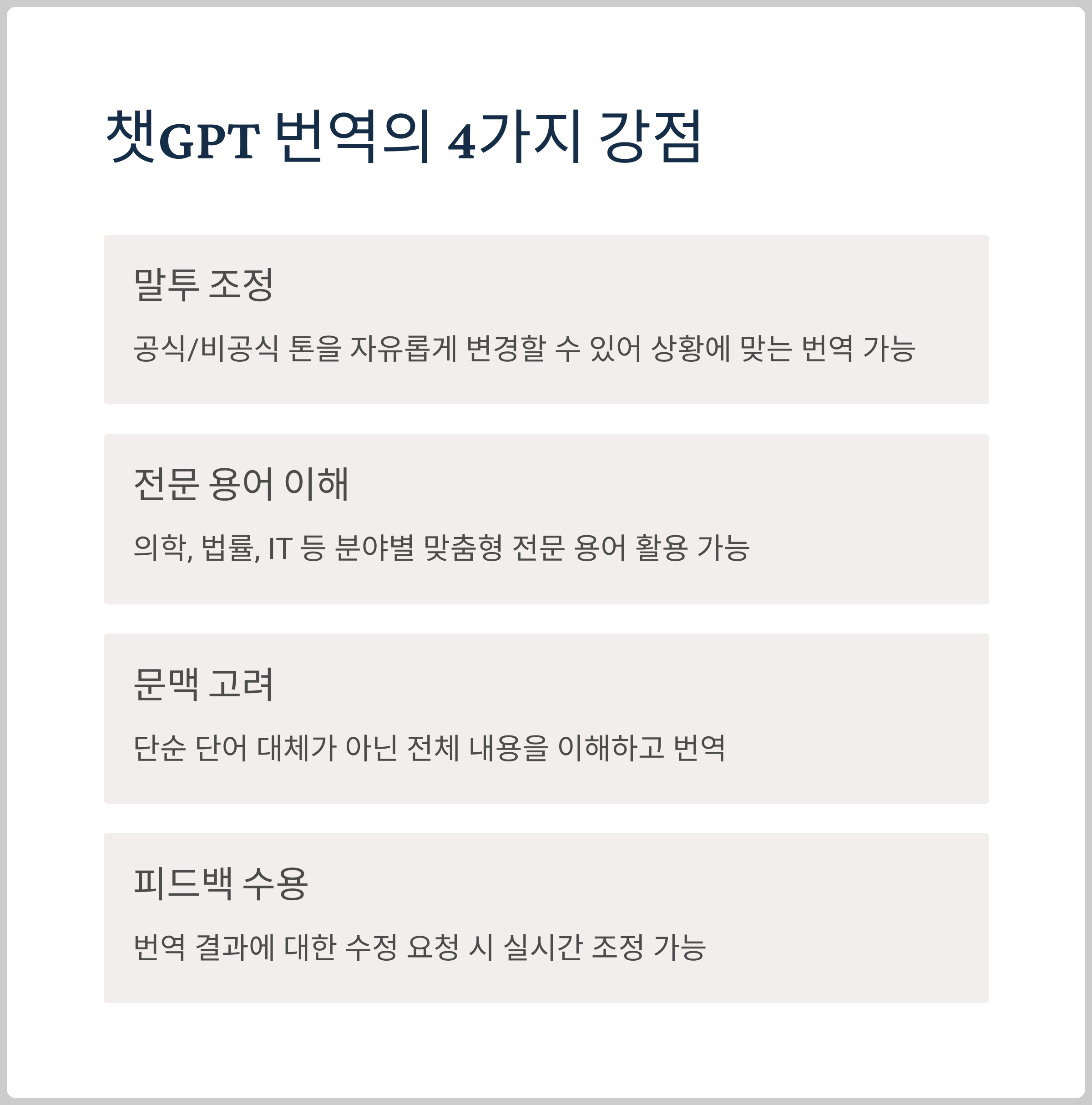 챗GPT는 단순한 번역기를 넘어 콘텐츠의 맥락, 스타일, 목적에 따라 유연하게 반응하는 AI 번역 도우미입니다.