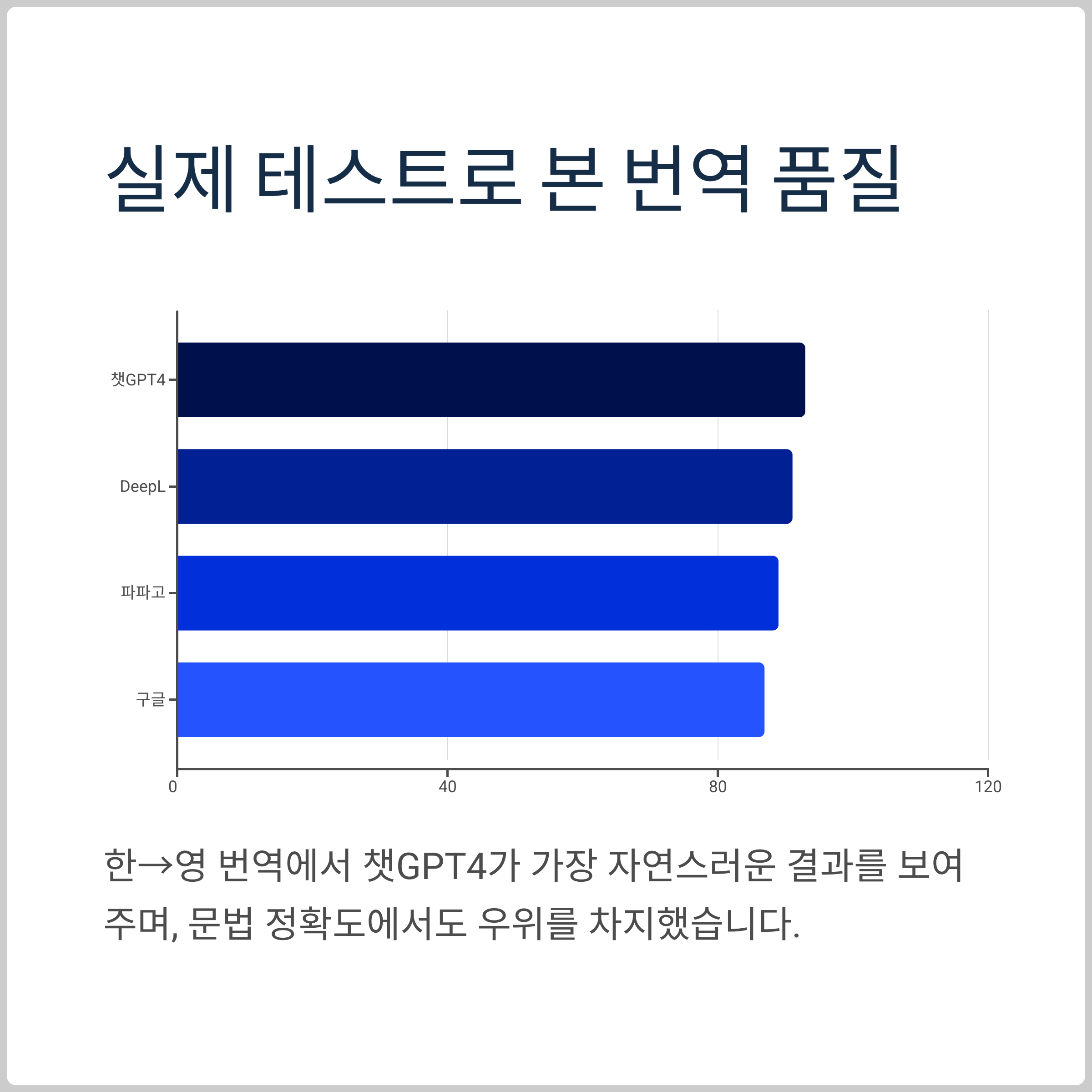 대부분의 문장에서 뛰어난 정확도를 보여주지만, 희귀한 문맥이나 너무 전문적인 분야는 사람의 검토가 필요합니다. 특히 관용구나 뉘앙스를 다룰 때 강점을 보입니다.