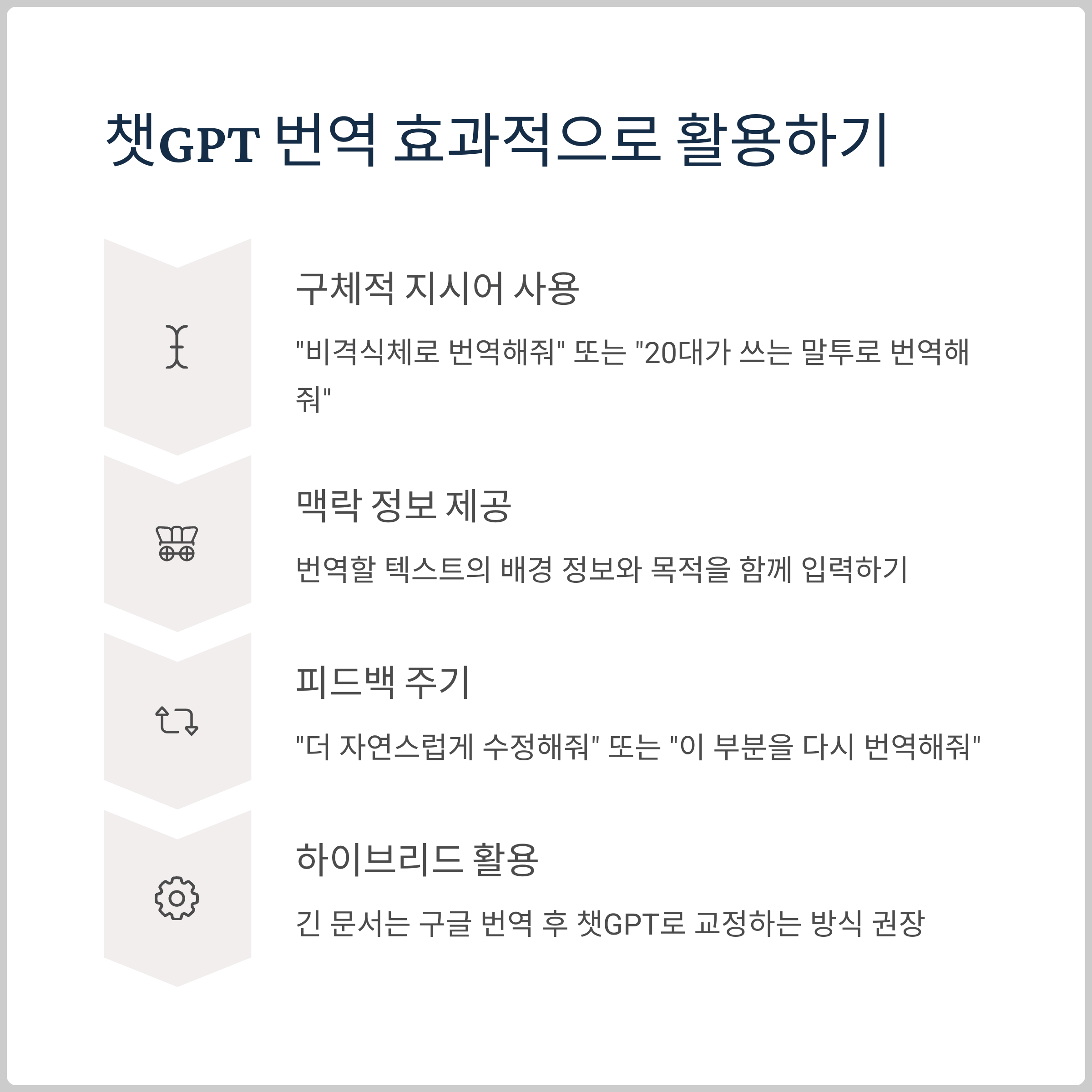 단순히 "번역해줘"보다 "이 내용을 영어 원어민 수준의 비즈니스 이메일로 바꿔줘"처럼 맥락과 톤을 명확히 하면 훨씬 정밀한 번역을 받을 수 있습니다.