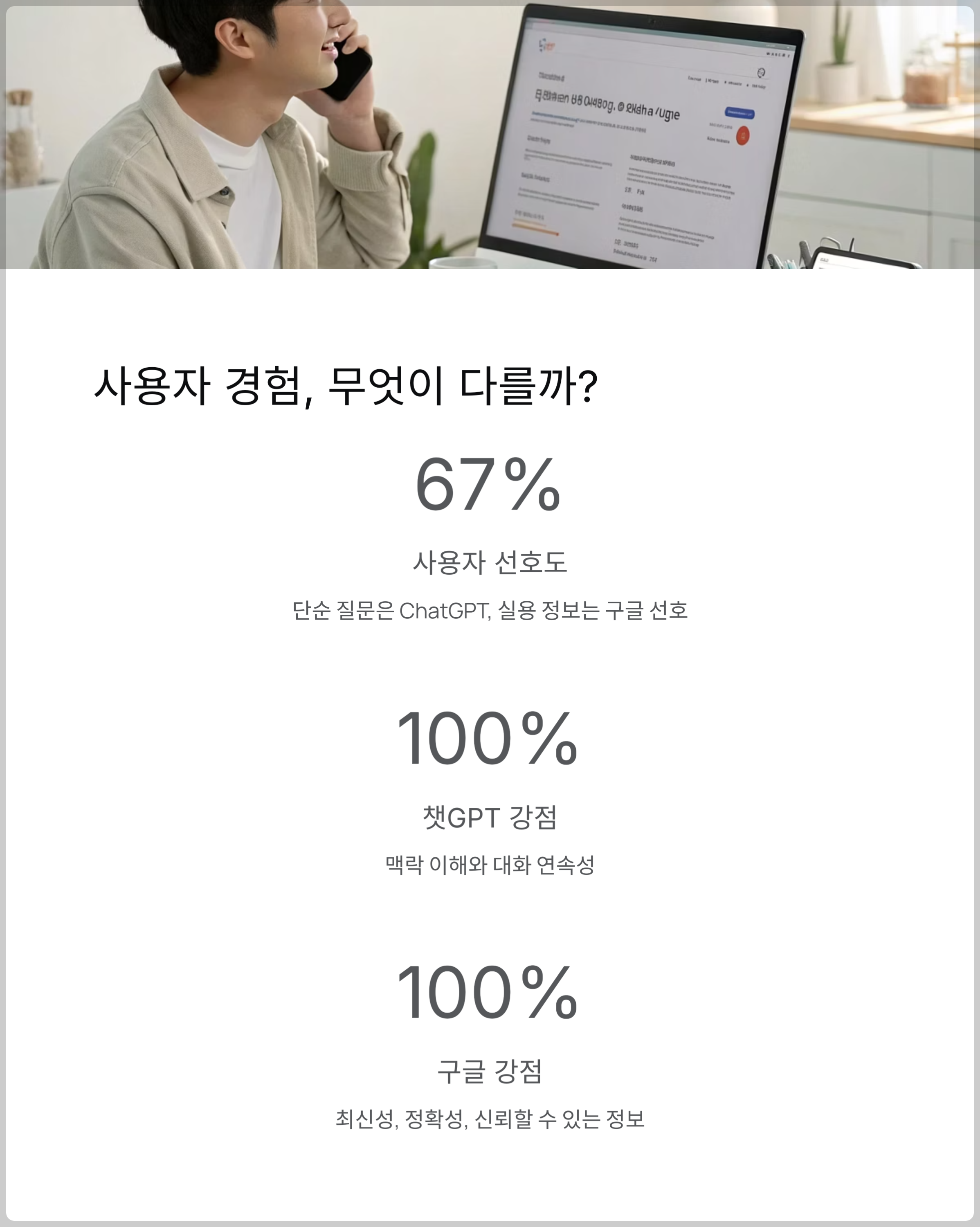 - 정확도: 챗GPT는 종합적이고 직관적인 답변을 제공, 구글은 객관적 출처 기반