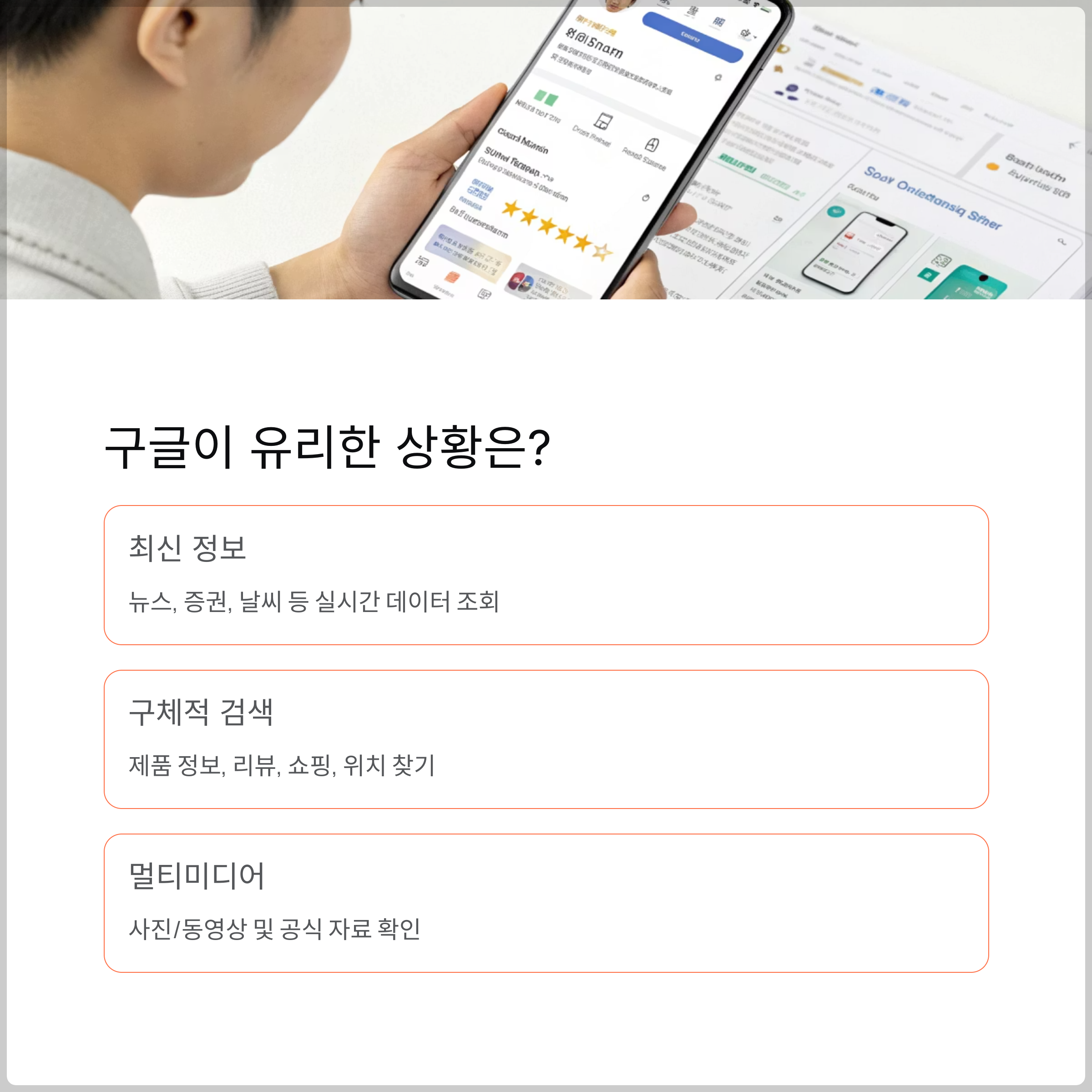예를 들어, 방금 발생한 사건, 주식 정보, 스포츠 결과 등 실시간 데이터가 필요할 때는 구글이 가장 빠릅니다.