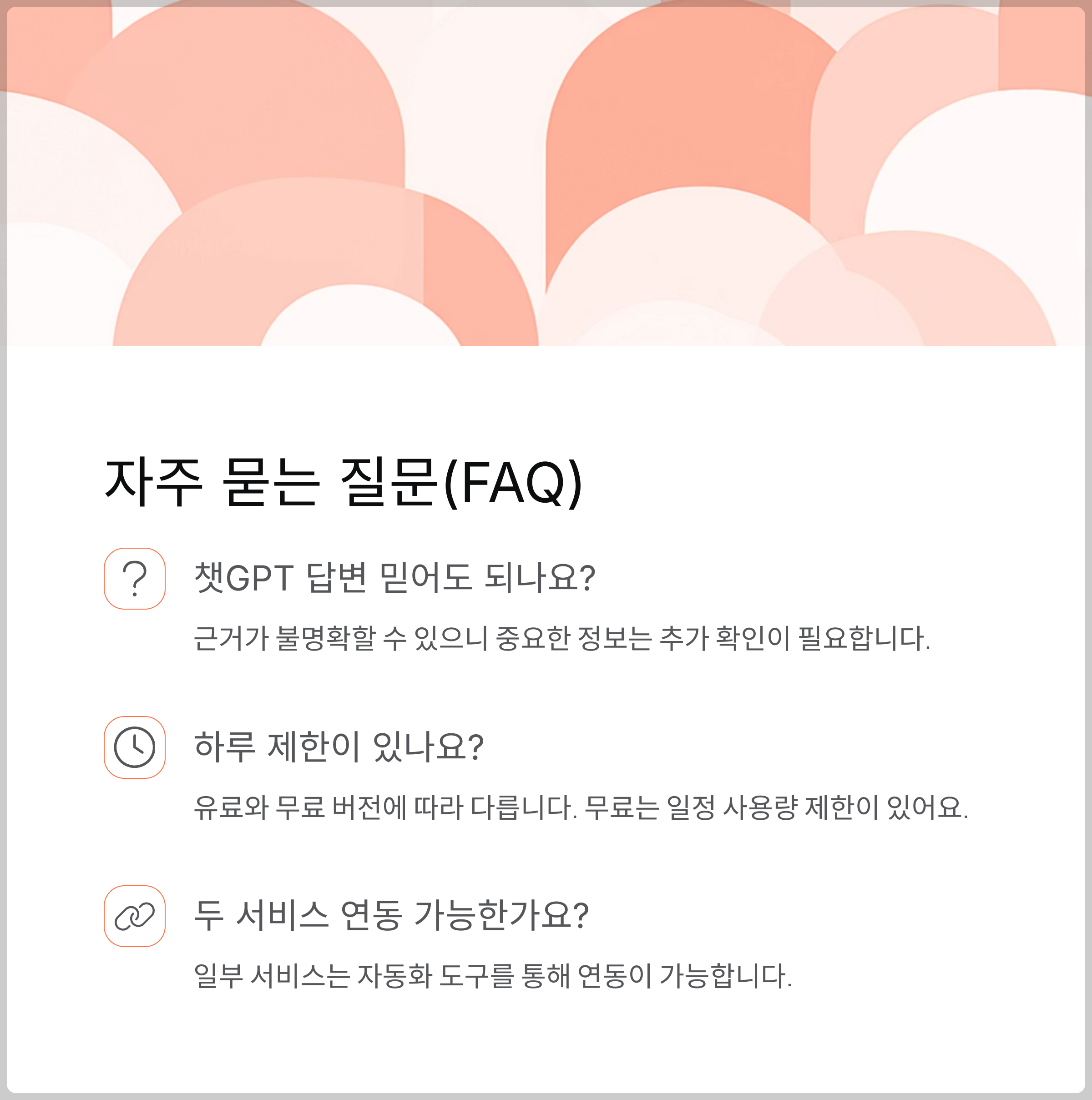 | 프로그래밍, 학습 | 챗GPT | 질문 형식으로 입력해 대화형 설명 활용 |