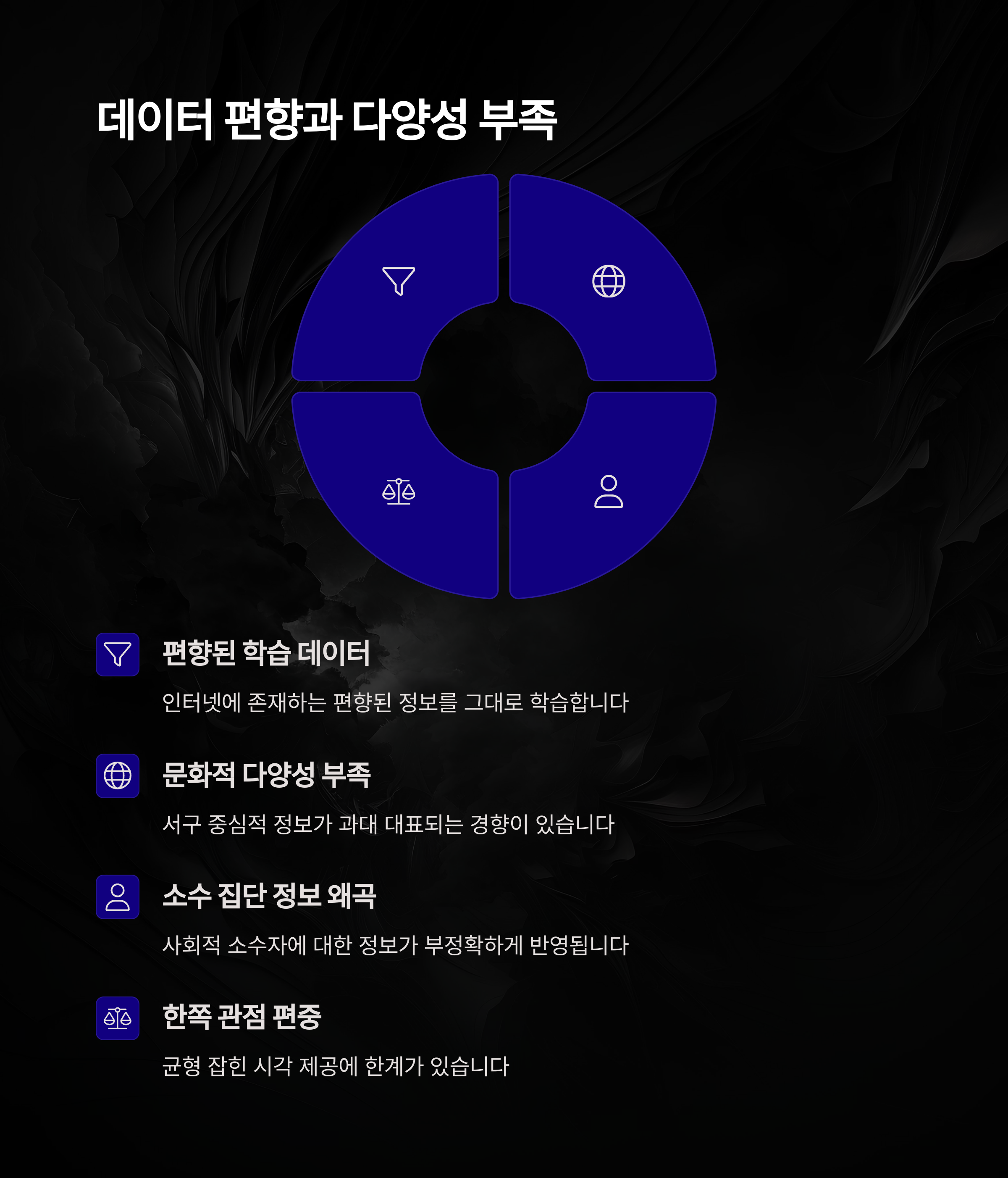 이는 소수자에 대한 부정확한 묘사나 특정 가치관의 과도한 반영 등으로 이어질 수 있어 주의가 필요합니다.