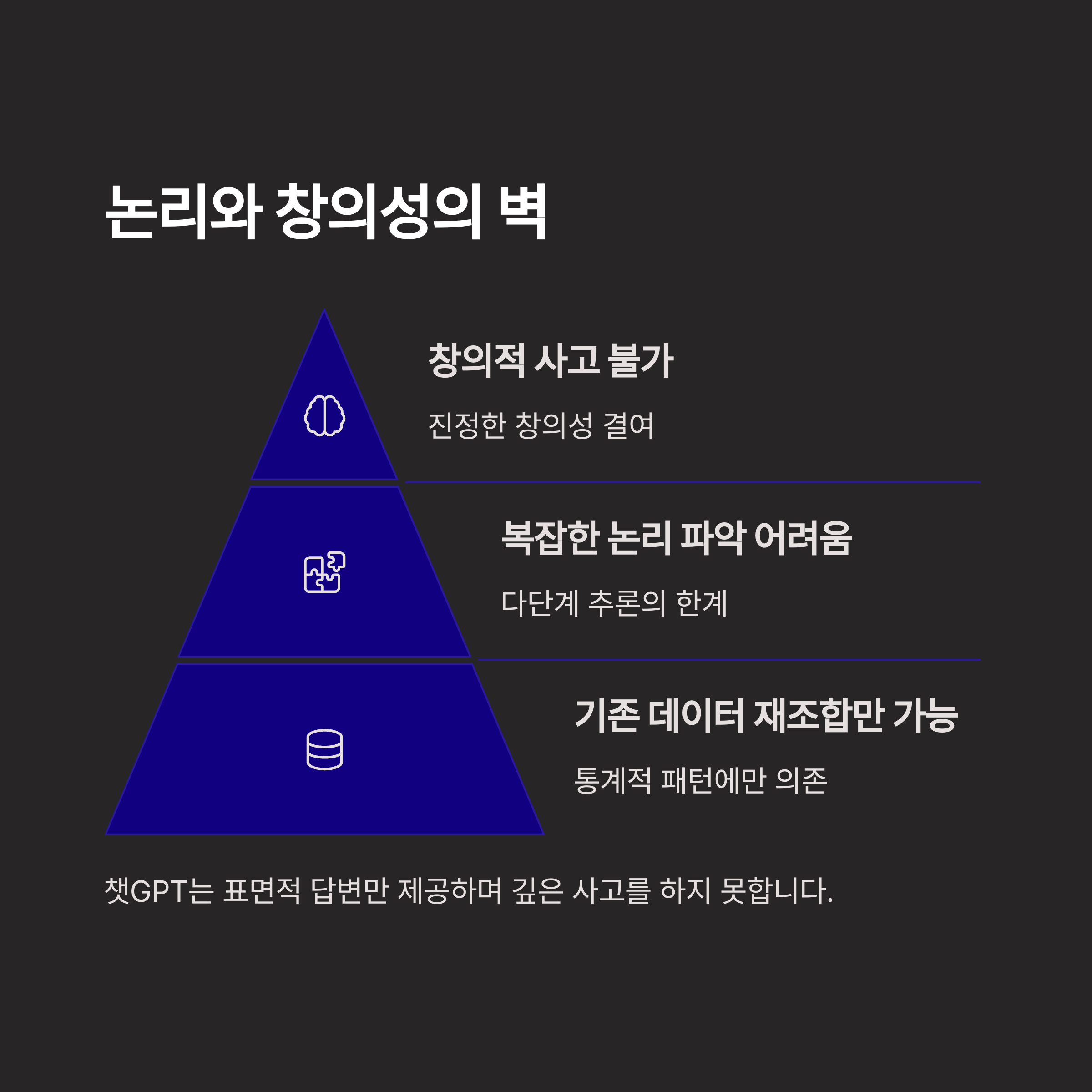 | 창의성의 제약 | 기존 학습 데이터 조합 이상을 벗어나기 어려움 |