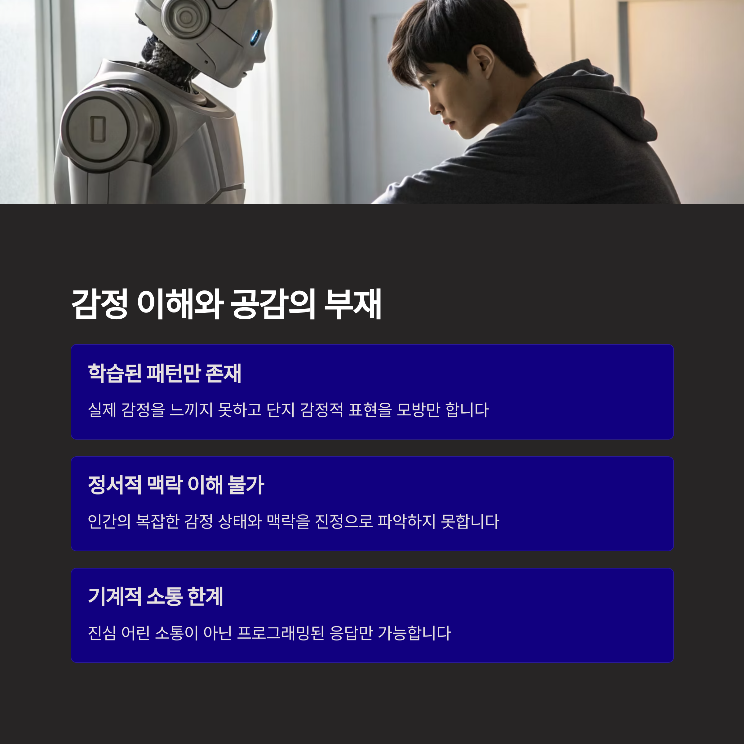 - 실제 감정 공감은 불가능하며, 모방된 언어로 위로할 뿐