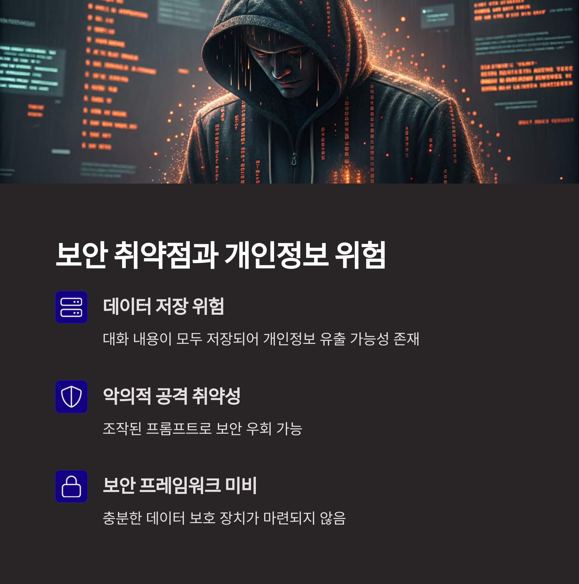 또한 '프롬프트 인젝션(prompt injection)' 같은 악의적인 입력을 통해 모델을 오작동하게 만들거나 훈련 데이터에서 민감 정보를 추출해내는 공격 가능성도 존재합니다.
