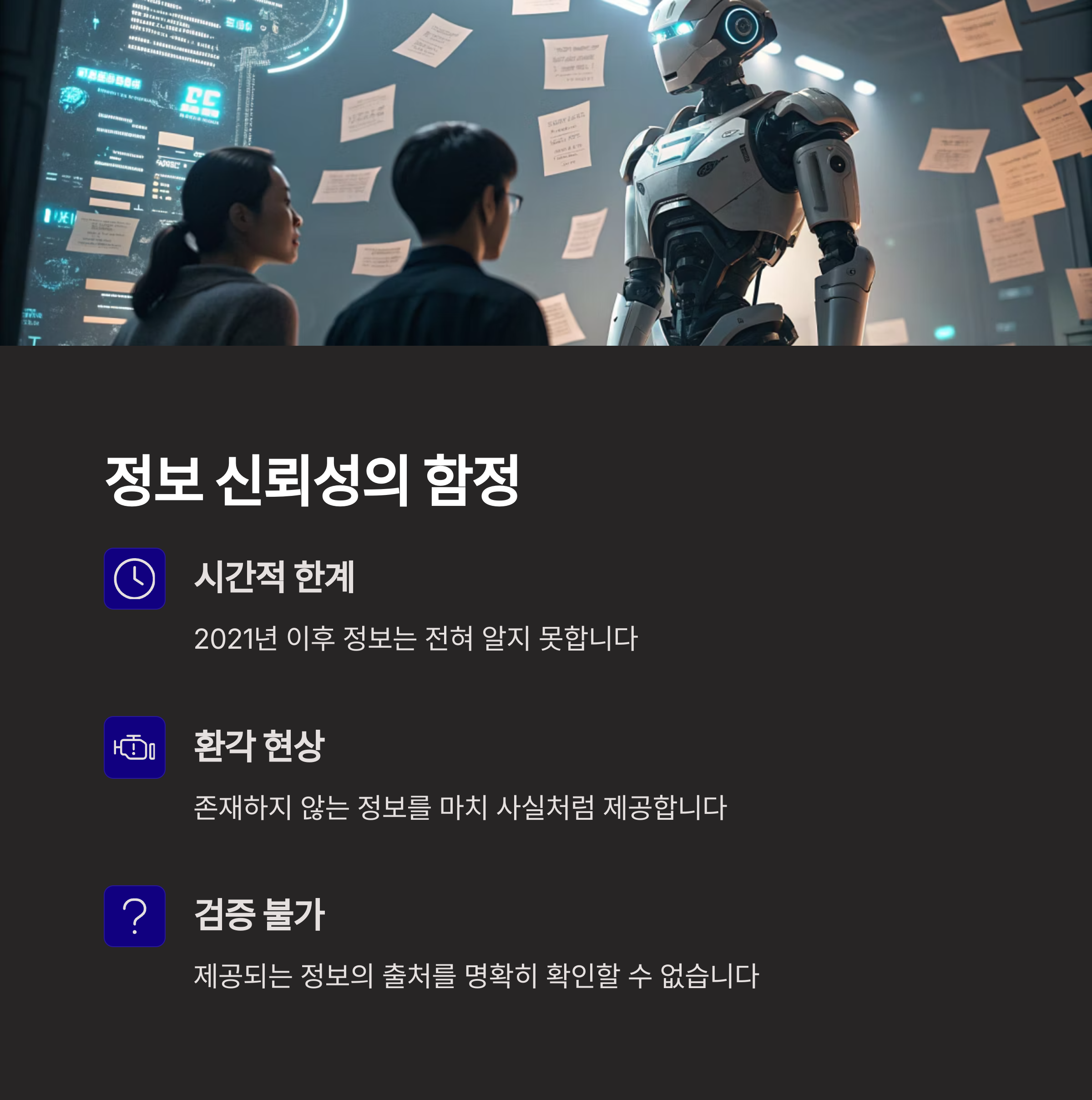 특히 '할루시네이션(Hallucination)' 현상처럼 사실과 다른 정보를 그럴듯하게 말하는 경우는 정보 신뢰도를 저해하는 주요 요인입니다.