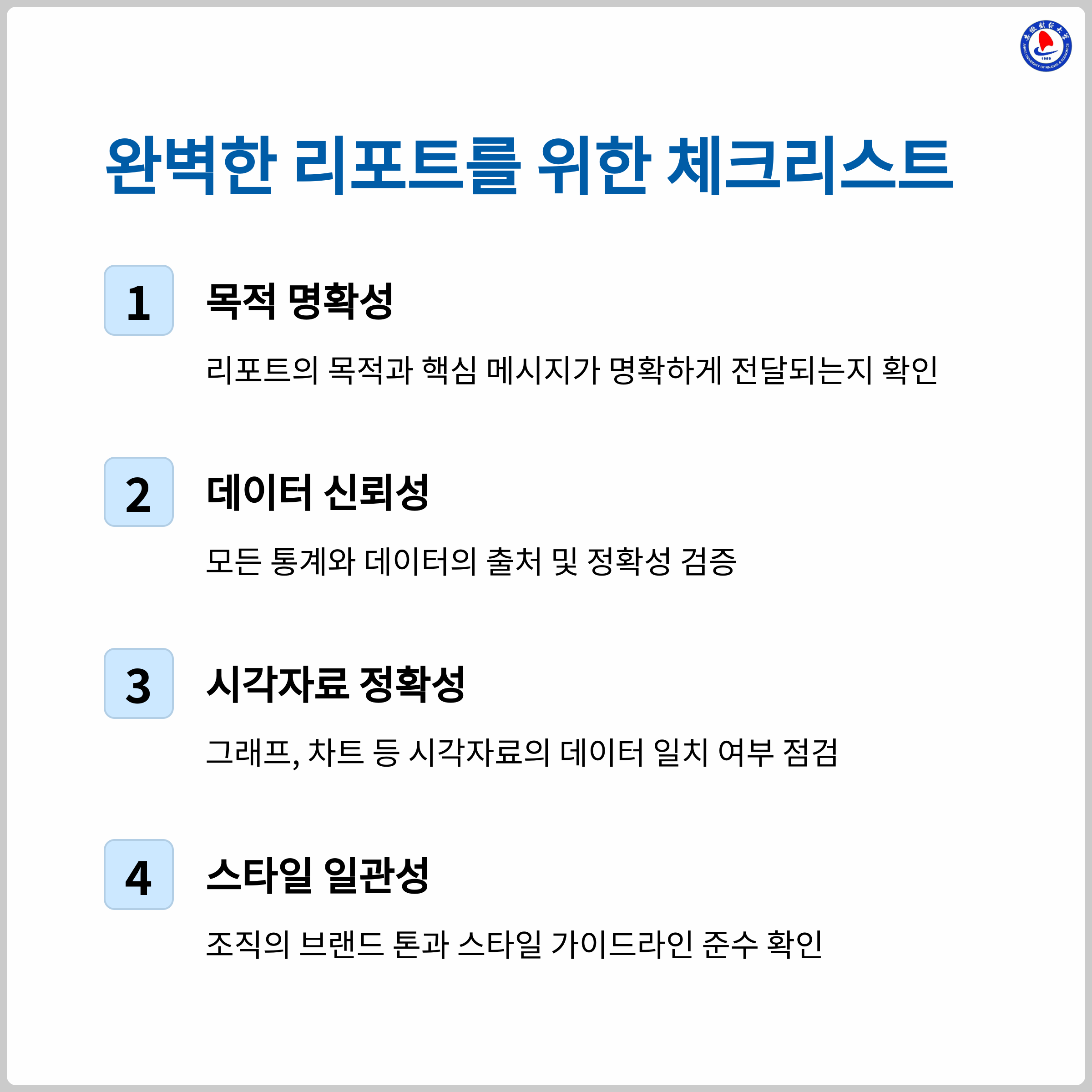 최종 리포트의 완성도를 점검하는 데 사용할 수 있는 체크리스트입니다. 출력 전 반드시 확인하세요.