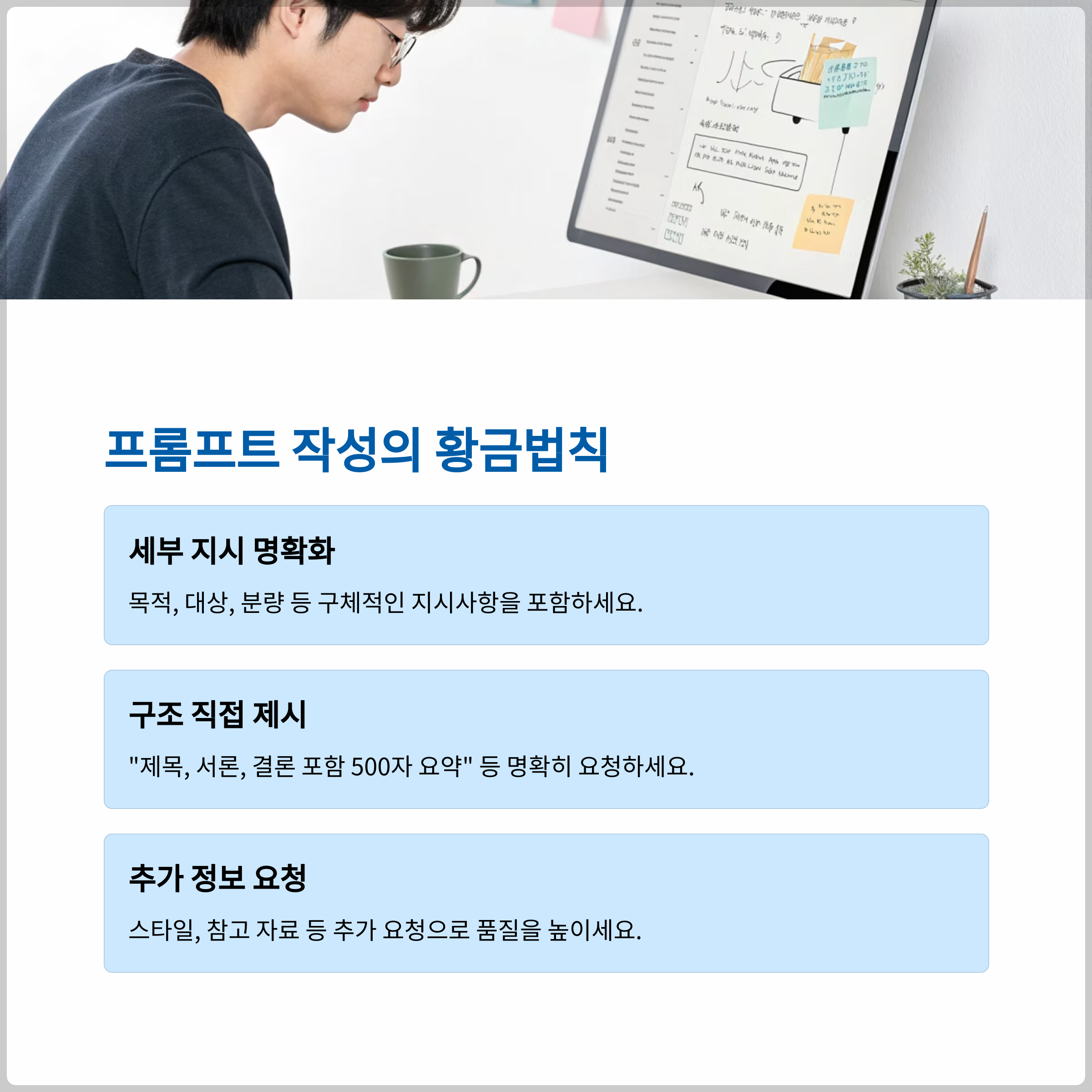 - 프롬프트에 ‘목표’, ‘대상’, ‘형식’, ‘스타일’을 구체적으로 명시하세요.