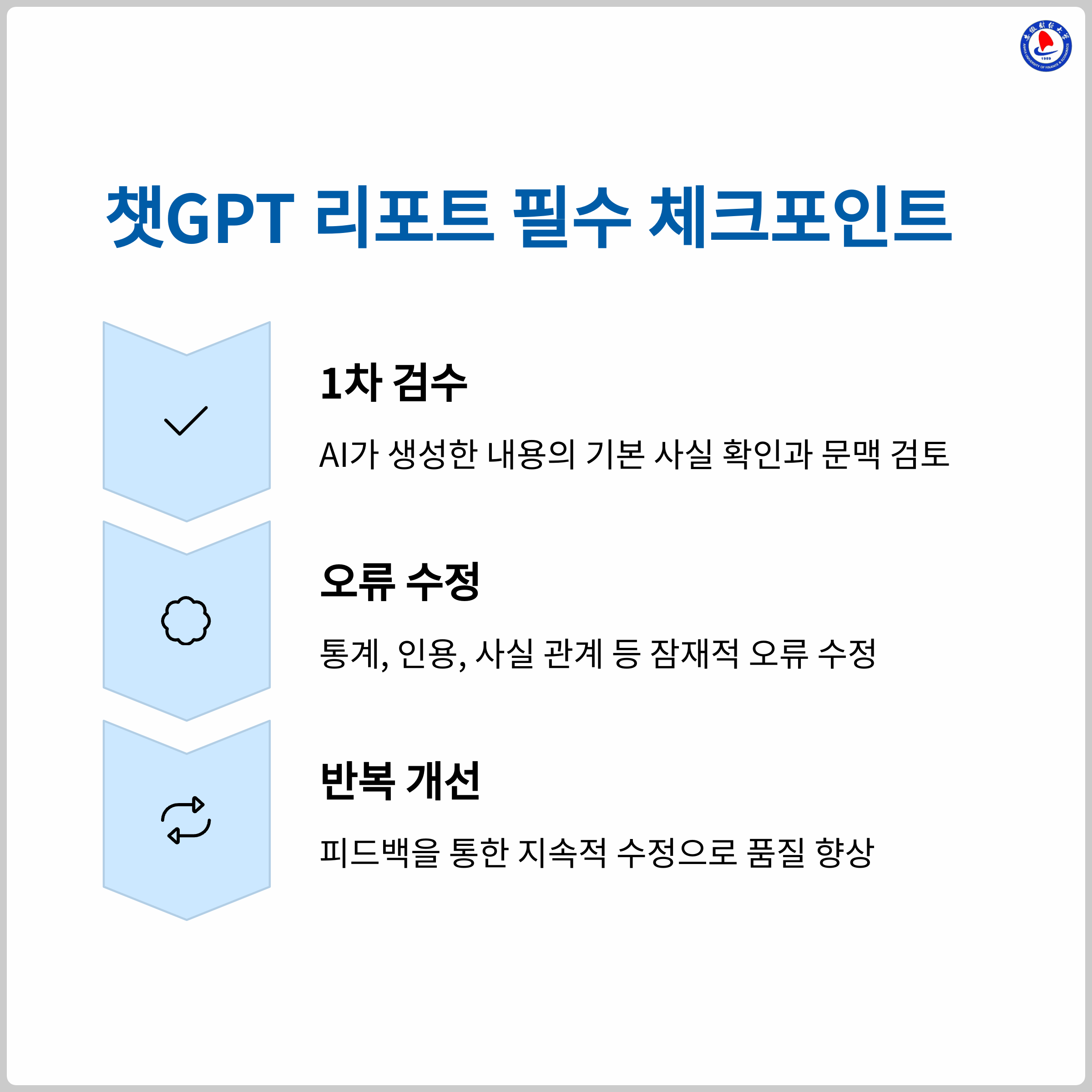 챗GPT가 제시하는 답변은 100% 완전하지 않기 때문에, 검토 및 수정 작업은 반드시 필요합니다. 잘못된 정보나 논리적 오류가 포함될 수 있으며, 그 결과가 곧 조직의 신뢰에 영향을 줄 수 있습니다. 따라서 아래의 체크포인트를 반드시 확인하세요.