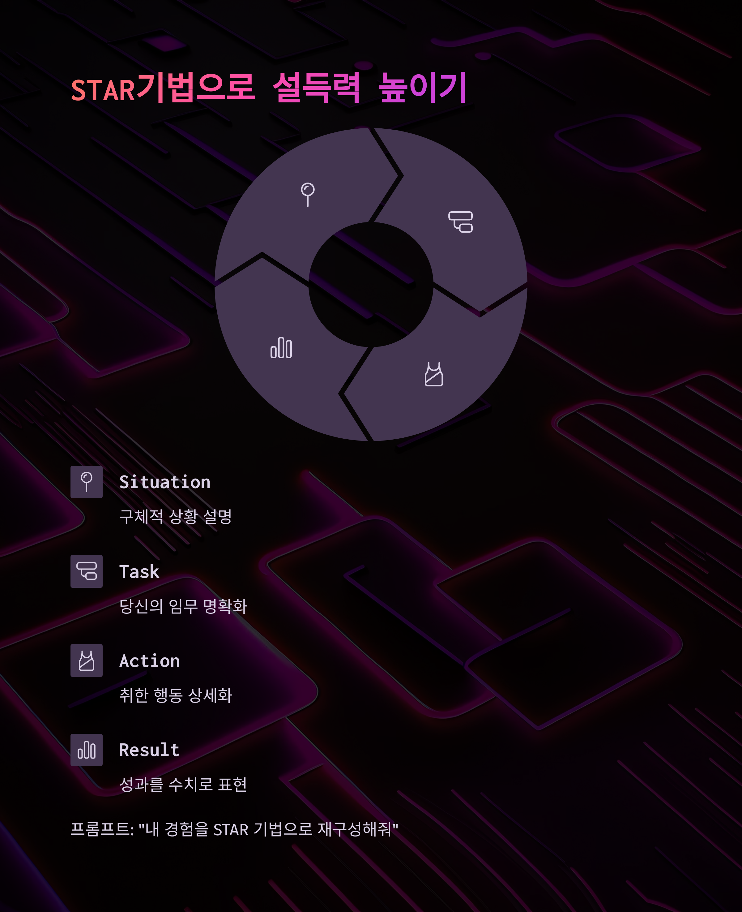 챗GPT는 STAR 기법(상황-과제-행동-결과)을 기반으로 한 면접 답변 작성에도 뛰어난 도움을 줍니다. 예를 들어 다음과 같은 프롬프트를 활용할 수 있습니다.