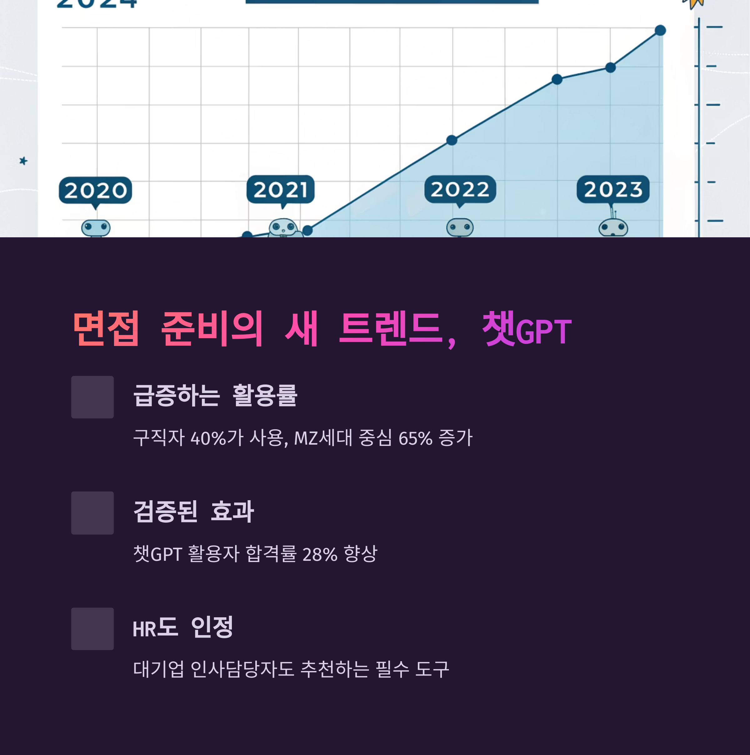 2025년 현재, 취업 준비생 10명 중 4명이 챗GPT를 활용하고 있으며, 특히 20대의 69.9%가 챗GPT와 같은 생성형 AI를 면접 준비에 이용하고 있습니다. 디시인사이드와 같은 온라인 커뮤니티에서 화제가 된 면접 질문을 시뮬레이션하는 것은 이제 일상화되었죠. 챗GPT를 활용하면 시간과 비용을 절감하면서도 맞춤형 면접 연습이 가능하다는 점이 주요한 장점입니다.