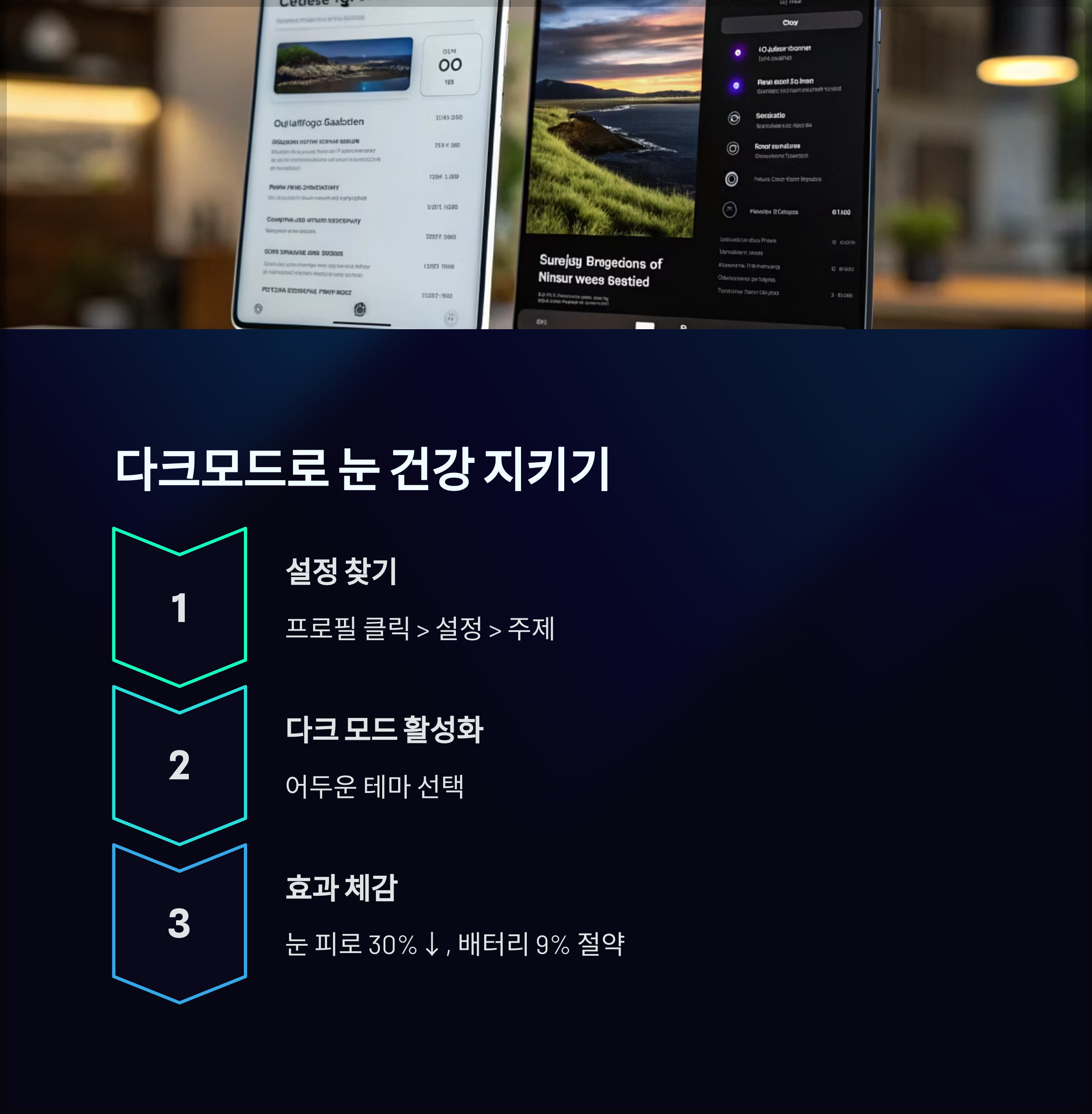 | 다크모드 활성화 | 인터페이스 배경을 어둡게 변경 | 눈 피로 감소, OLED/AMOLED 기기 배터리 절약 |