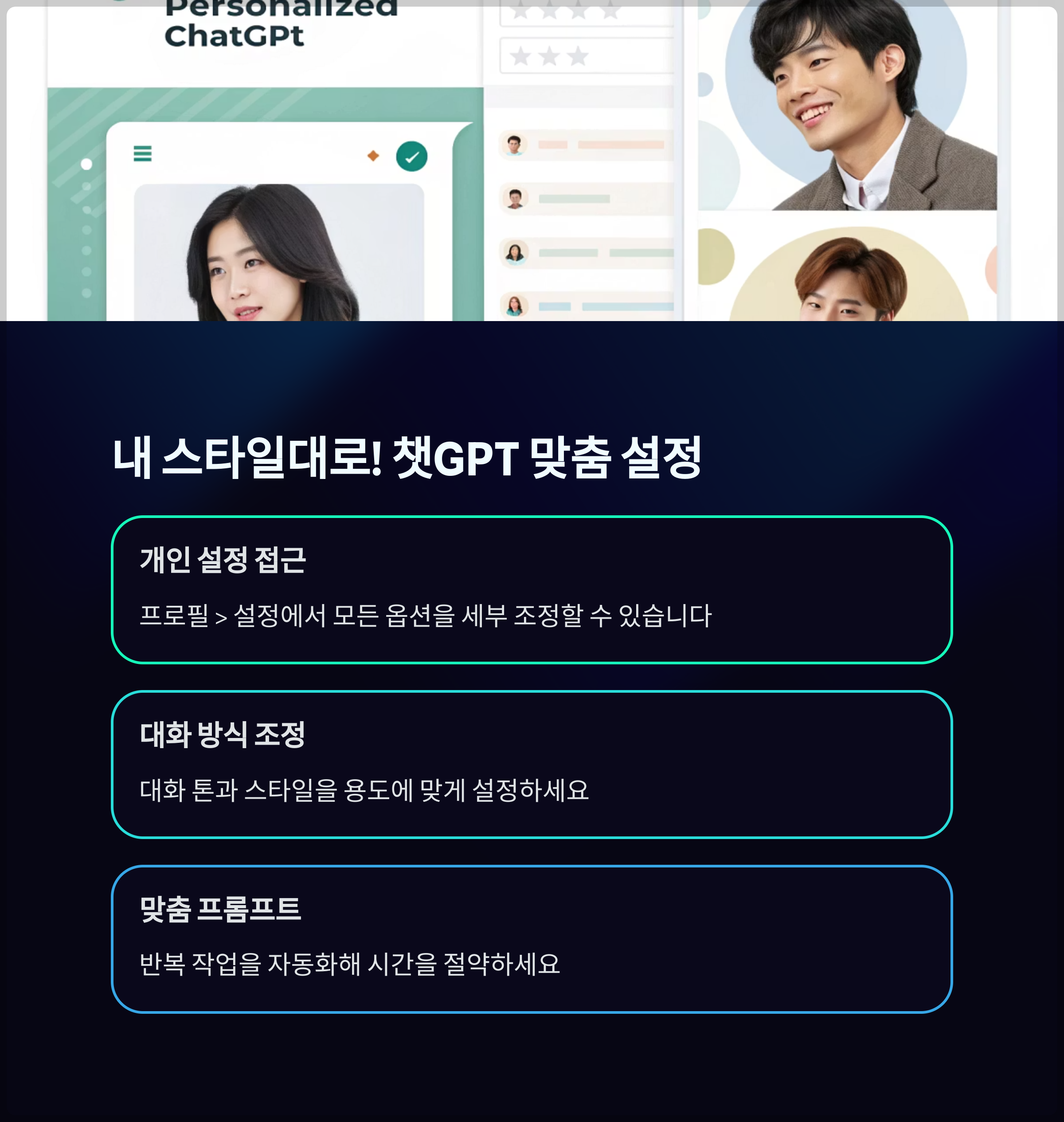 챗GPT, 단순히 질문하고 답변 받는 데만 사용하고 계신가요? 숨겨진 강력한 개인화 설정들을 활용하면 챗GPT를 나만의 완벽한 AI 비서로 만들 수 있습니다!
