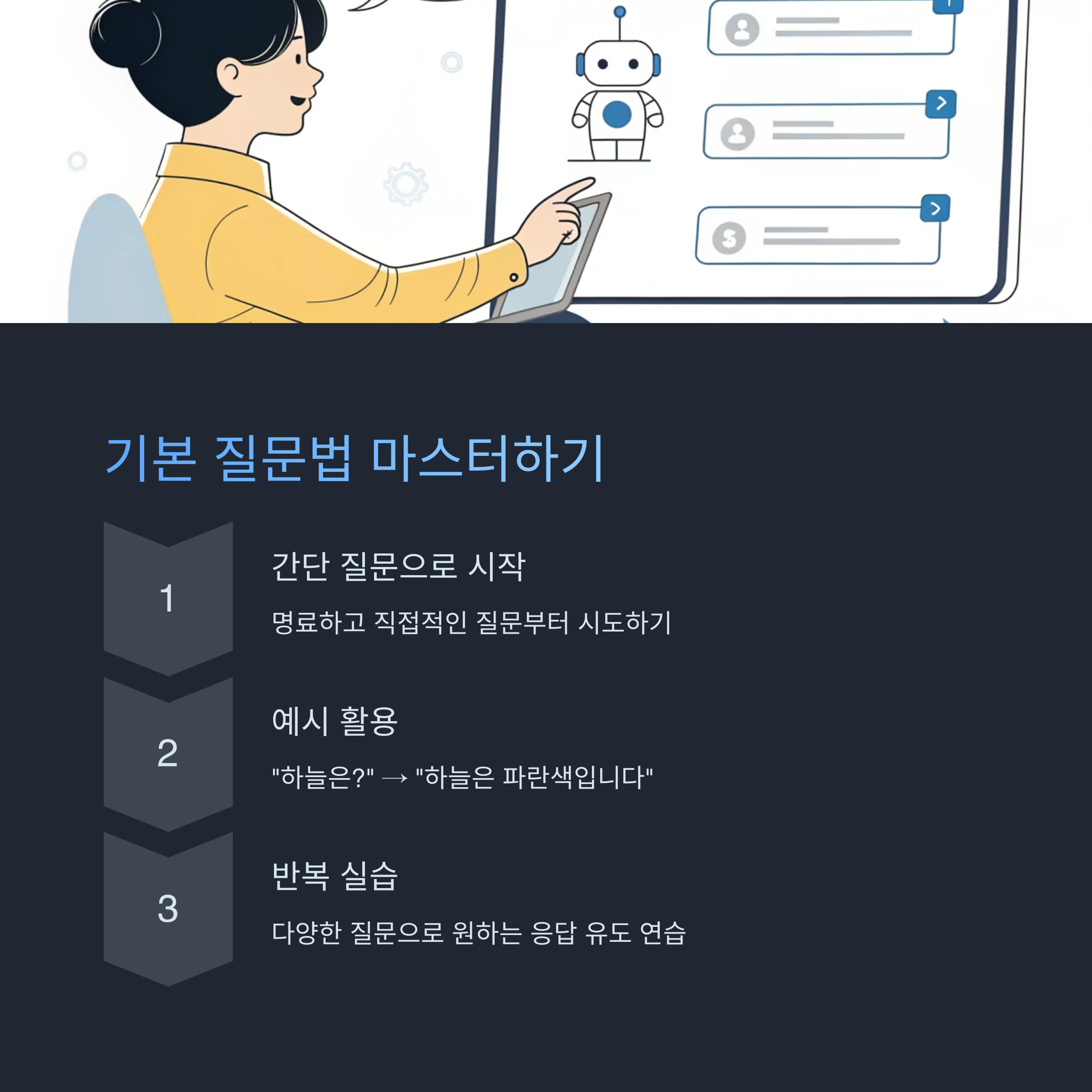 - 이 질문법은 간단한 정보 요청이나 빠른 요약이 필요할 때 유용합니다. 하지만 답변의 깊이나 구체성이 부족할 수 있으므로, 복잡한 질문에는 다음 단계의 질문법을 활용하는 것이 좋습니다.