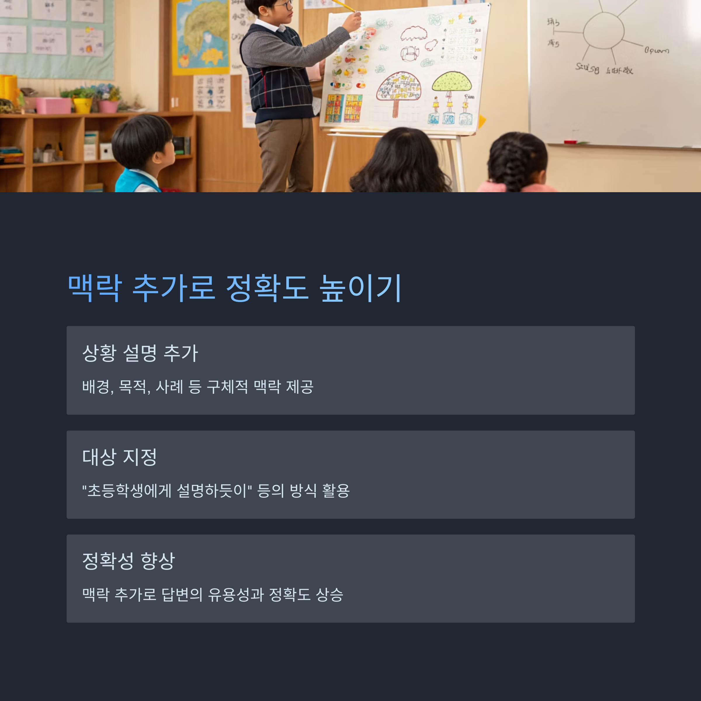 - 맥락을 추가하면 AI는 단순히 정보를 나열하는 것을 넘어, 특정 관점에서 정보를 재구성하거나 특정 스타일로 답변을 제공할 수 있게 됩니다. 이는 사용자 맞춤형 답변을 얻는 데 중요한 단계입니다.