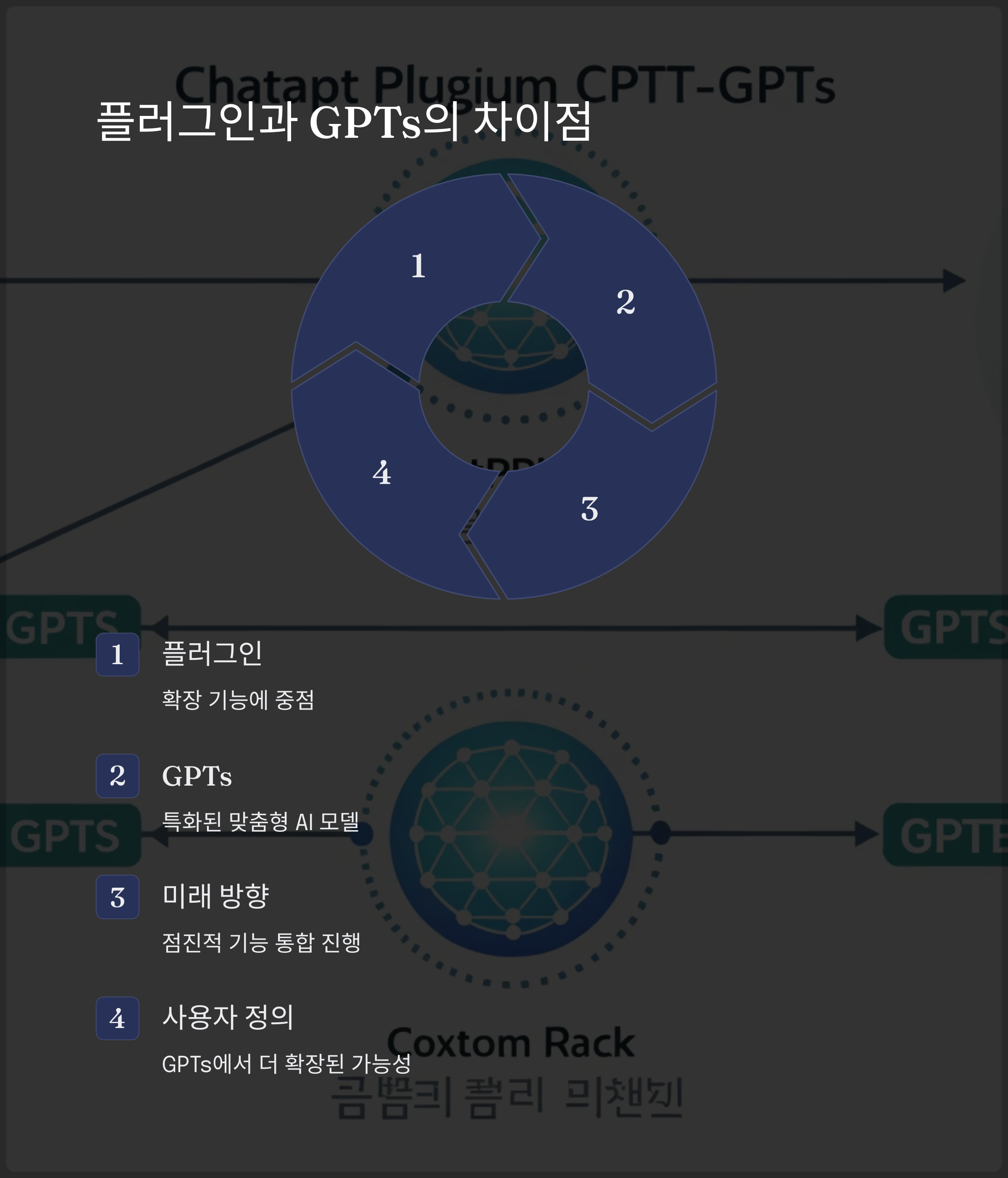 플러그인은 기존 챗GPT에 기능을 추가하는 방식이고, GPTs는 사용자가 직접 기능과 성격을 설정한 맞춤형 GPT를 만드는 구조입니다. 앞으로는 GPTs가 플러그인을 대체할 것으로 예상되며, 더 다양한 기능을 통합한 형태로 발전 중입니다.