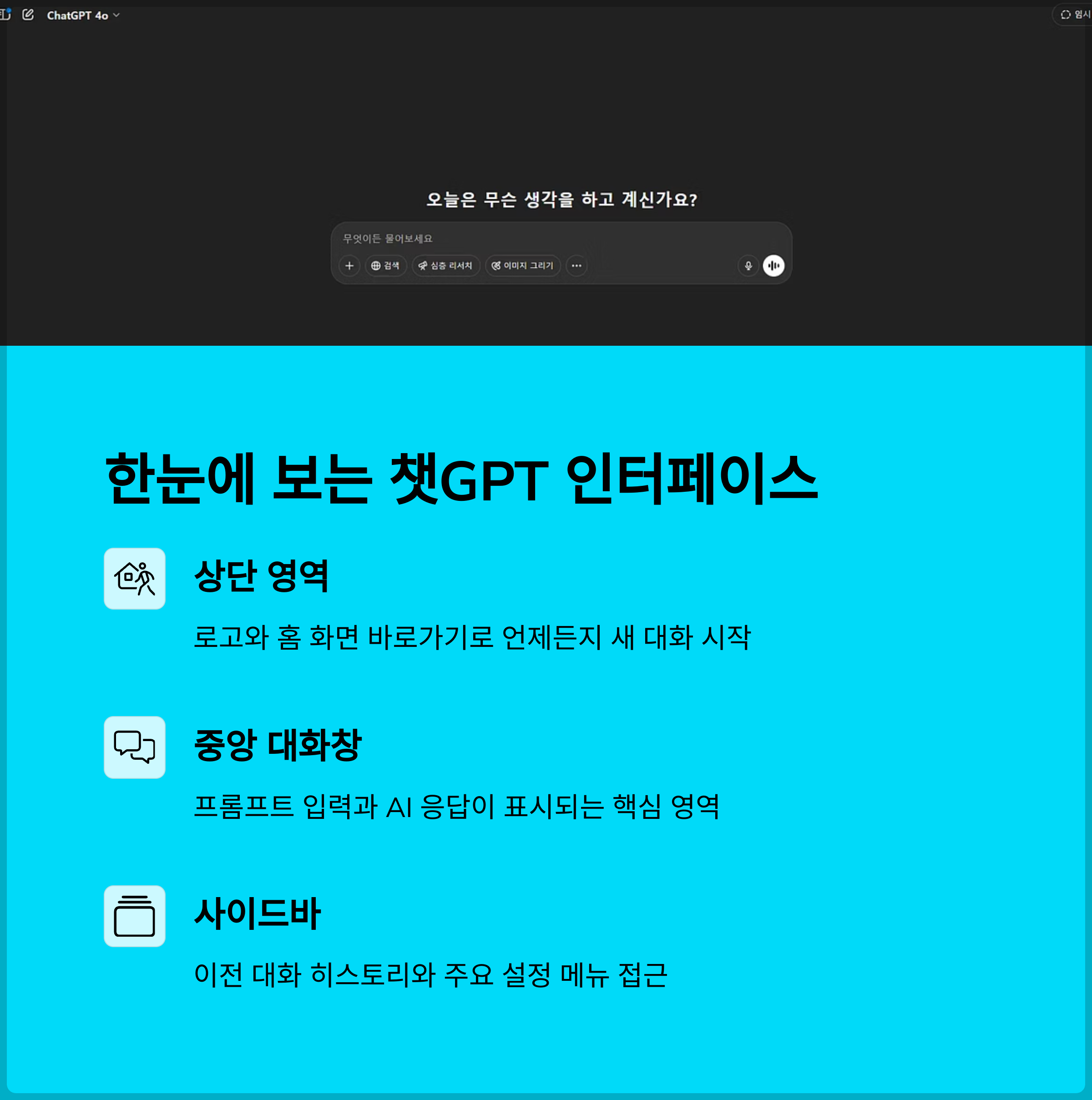 챗GPT의 화면과 기능은 생각보다 단순하고 직관적입니다.