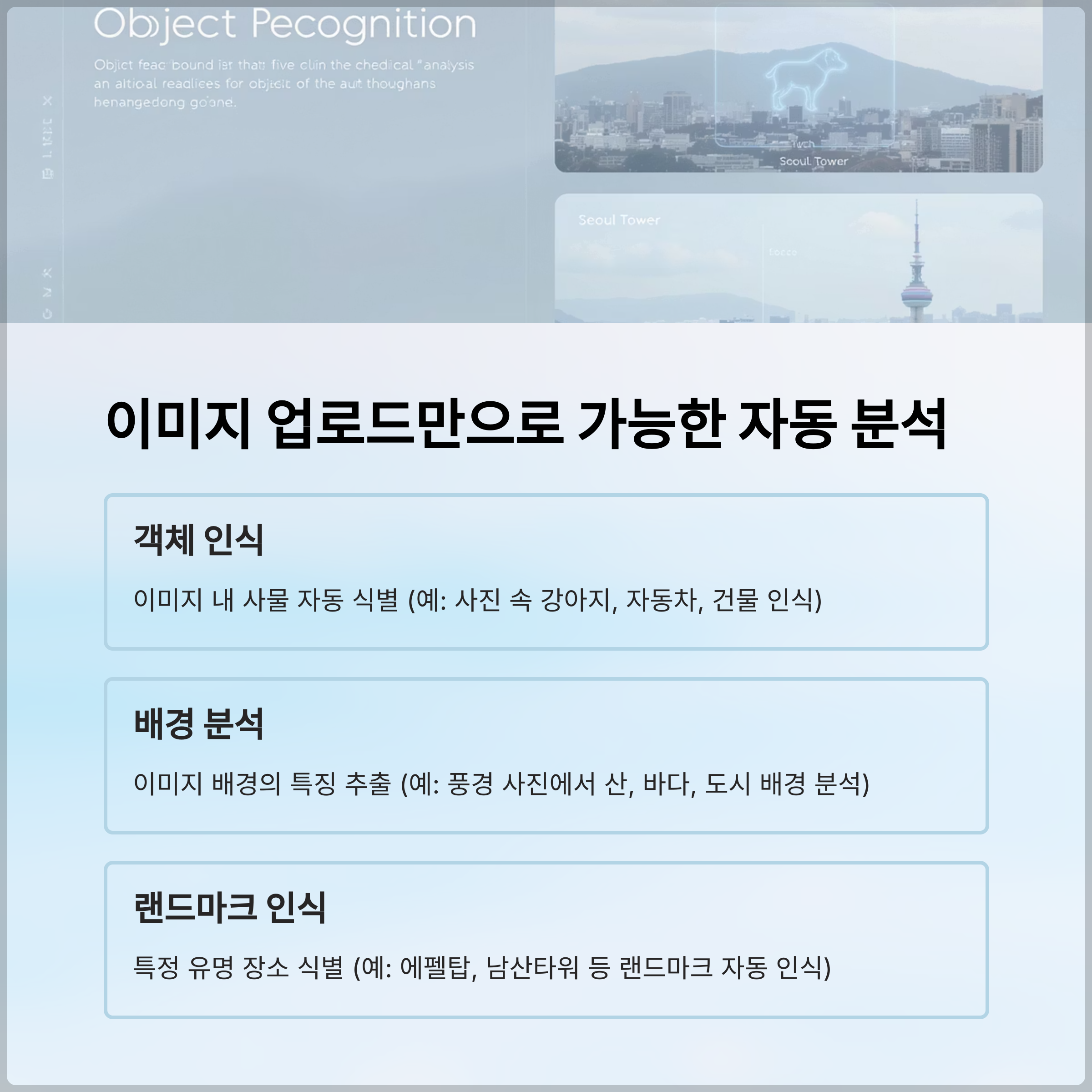 | 랜드마크 인식 | 특정 유명 장소 식별 | 에펠탑, 남산타워 등 랜드마크 자동 인식 |