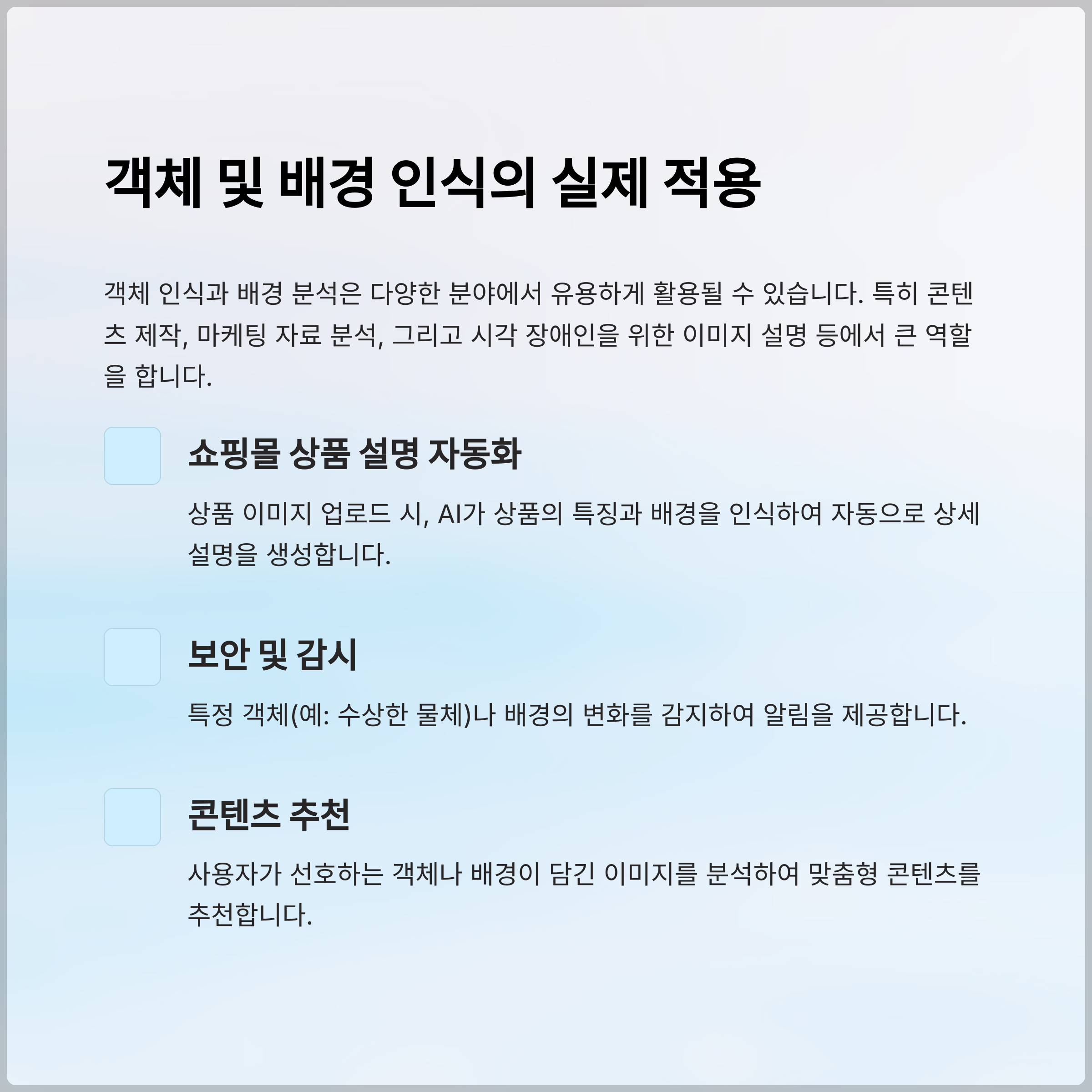 객체 인식과 배경 분석은 다양한 분야에서 유용하게 활용될 수 있습니다. 특히 콘텐츠 제작, 마케팅 자료 분석, 그리고 시각 장애인을 위한 이미지 설명 등에서 큰 역할을 합니다.