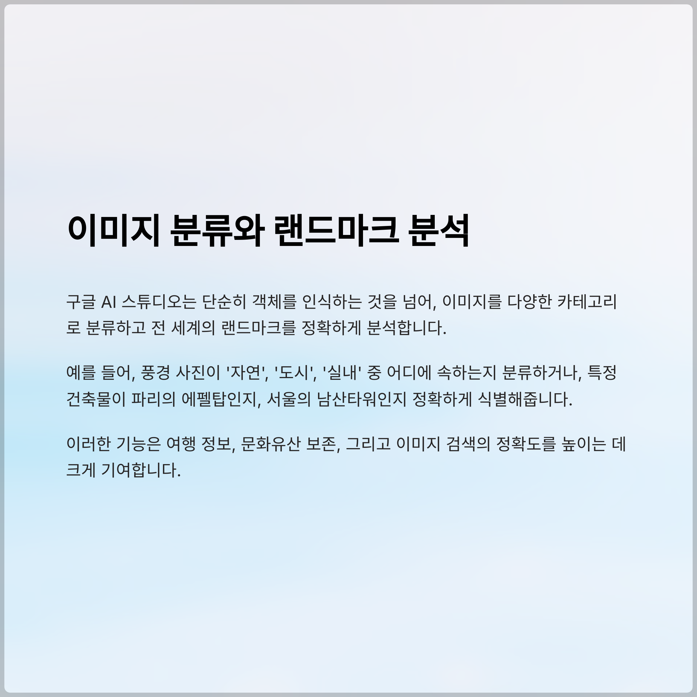 구글 AI 스튜디오는 단순히 객체를 인식하는 것을 넘어, 이미지를 다양한 카테고리로 분류하고 전 세계의 랜드마크를 정확하게 분석합니다. 예를 들어, 풍경 사진이 '자연', '도시', '실내' 중 어디에 속하는지 분류하거나, 특정 건축물이 파리의 에펠탑인지, 서울의 남산타워인지 정확하게 식별해줍니다. 이러한 기능은 여행 정보, 문화유산 보존, 그리고 이미지 검색의 정확도를 높이는 데 크게 기여합니다.