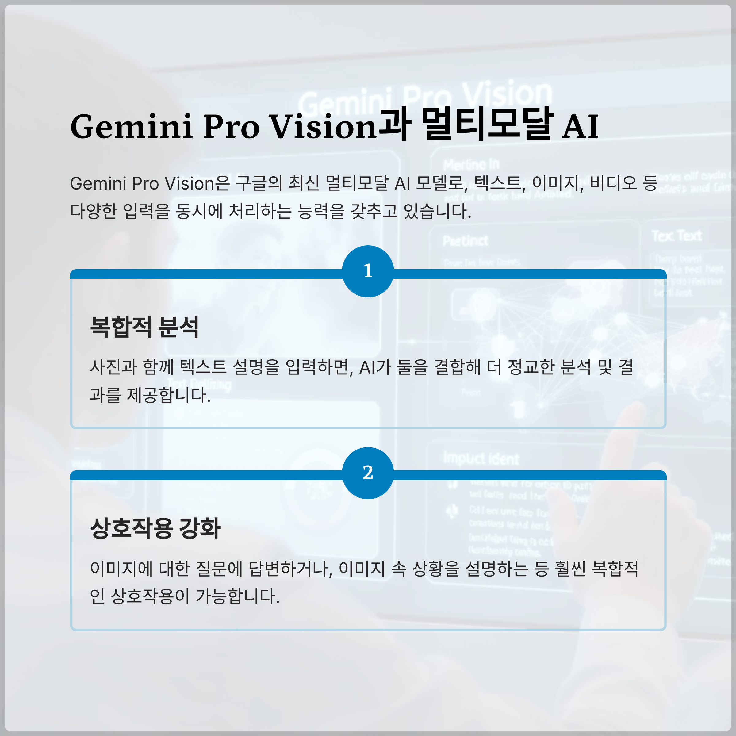 Gemini Pro Vision은 구글의 최신 멀티모달 AI 모델로, 텍스트, 이미지, 비디오 등 다양한 입력을 동시에 처리하는 능력을 갖추고 있습니다. 예를 들어, 사진과 함께 텍스트 설명을 입력하면, AI가 둘을 결합해 더 정교한 분석 및 결과를 제공합니다.