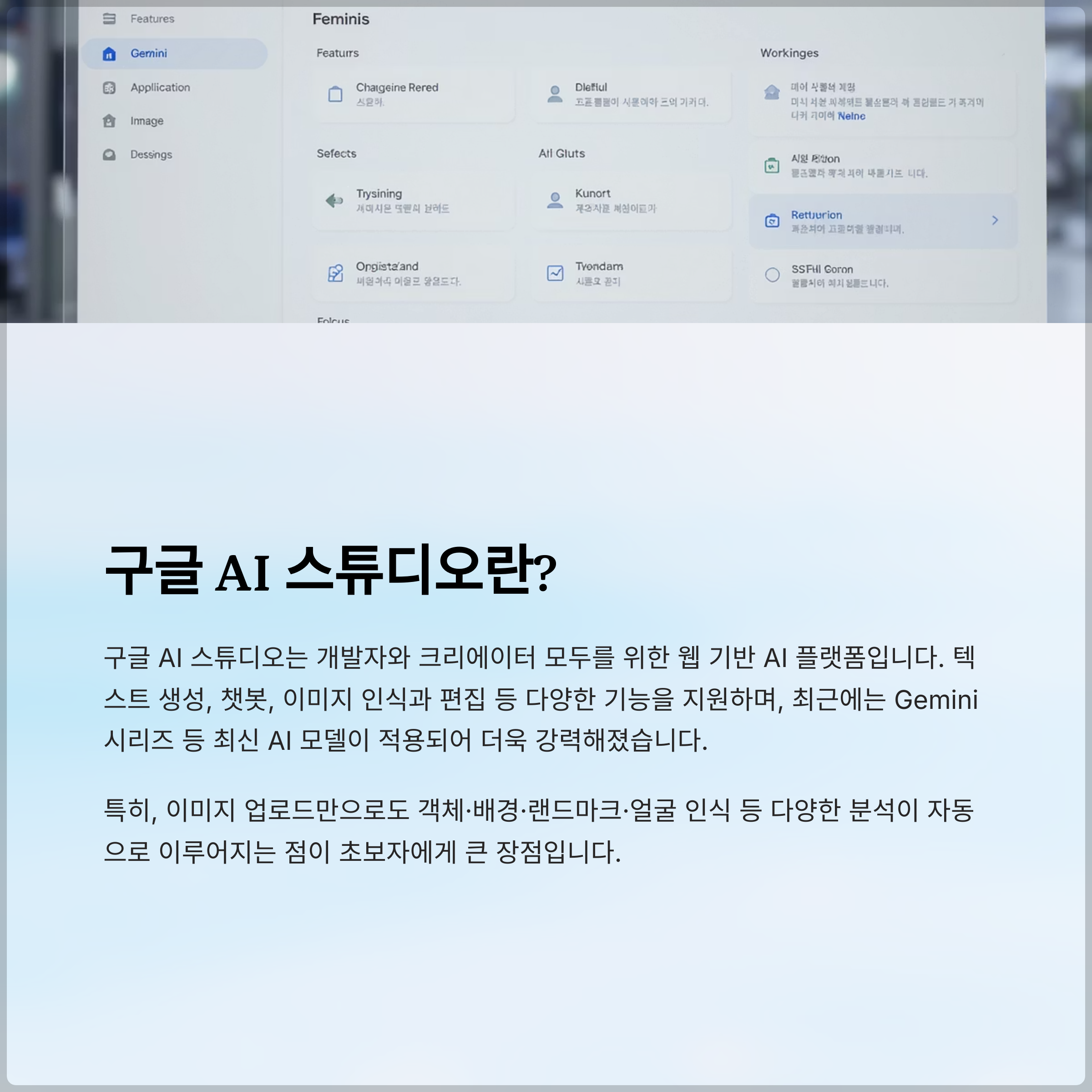 구글 AI 스튜디오는 개발자와 크리에이터 모두를 위한 웹 기반 AI 플랫폼입니다. 텍스트 생성, 챗봇, 그리고 이미지 인식과 편집 등 다양한 기능을 지원하며, 최근에는 Gemini 시리즈 등 최신 AI 모델이 적용되어 더욱 강력해졌습니다.
