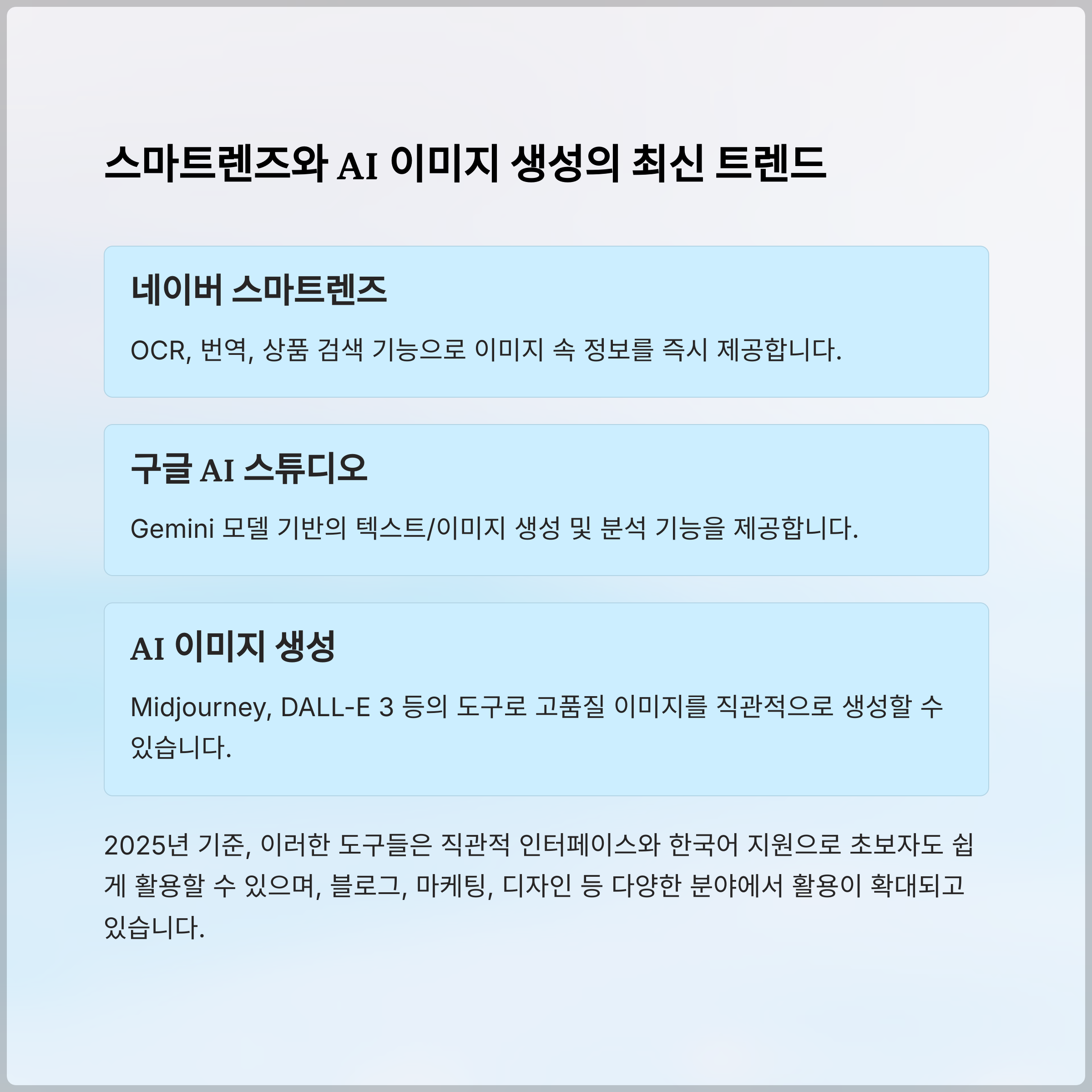 또한, 최근에는 AI 이미지 생성 도구들이 급부상하고 있습니다. 2025년 기준, 구글 AI 스튜디오와 다양한 AI 이미지 생성 도구(Flamel, Midjourney, DALL-E 3 등)는 직관적 인터페이스와 한국어 지원으로 초보자도 쉽게 이미지를 생성할 수 있으며, 블로그, 마케팅, 디자인 등 다양한 분야에서 활용이 확대되고 있습니다.